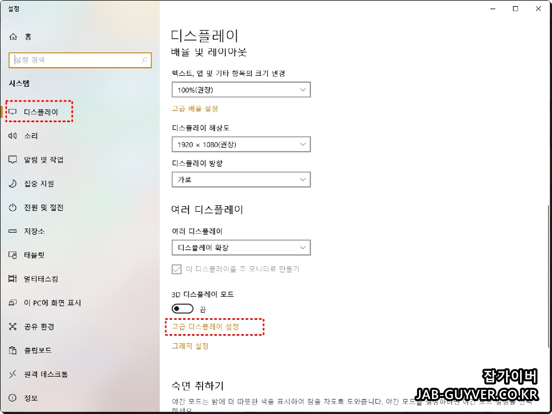 디스플레이 -> 고급 디스플레이 설정으로 들어갑니다.