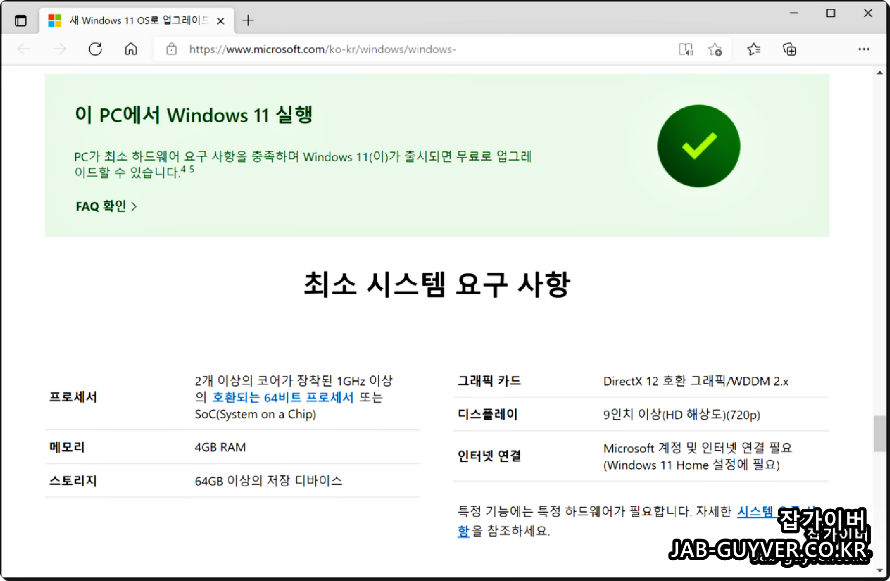 윈도우11 설치하기 위한 최소요구사항을 참고하세요
