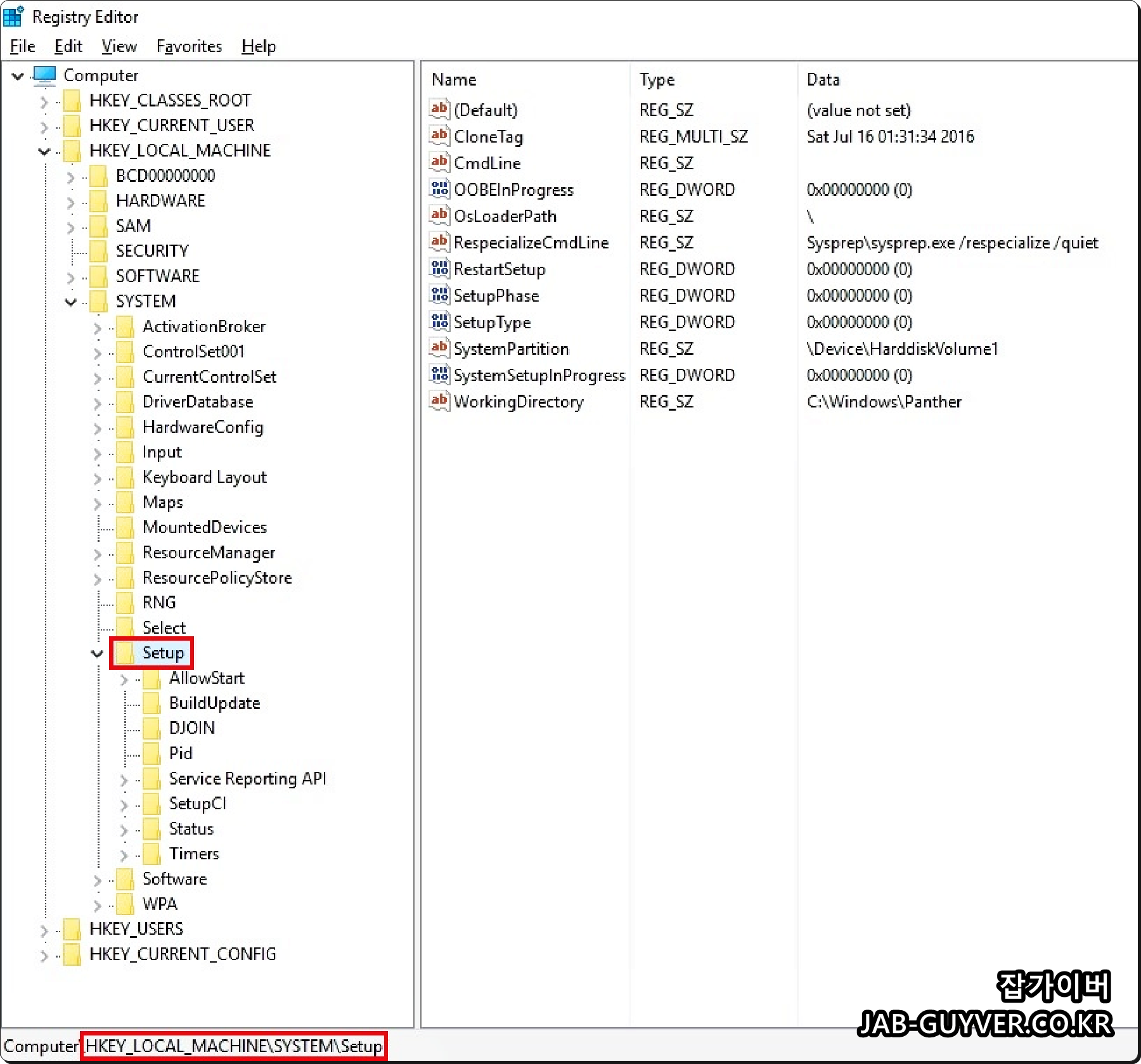 HKEY_LOCAL_MACHINE\SYSTEM\Setup 로 이동합니다.