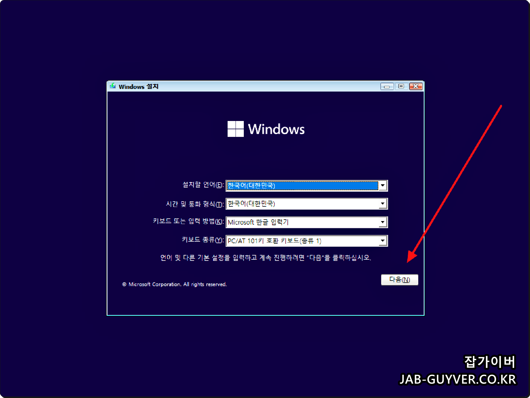 이후 평소와 같이 윈도우11 설치를 진행합니다.