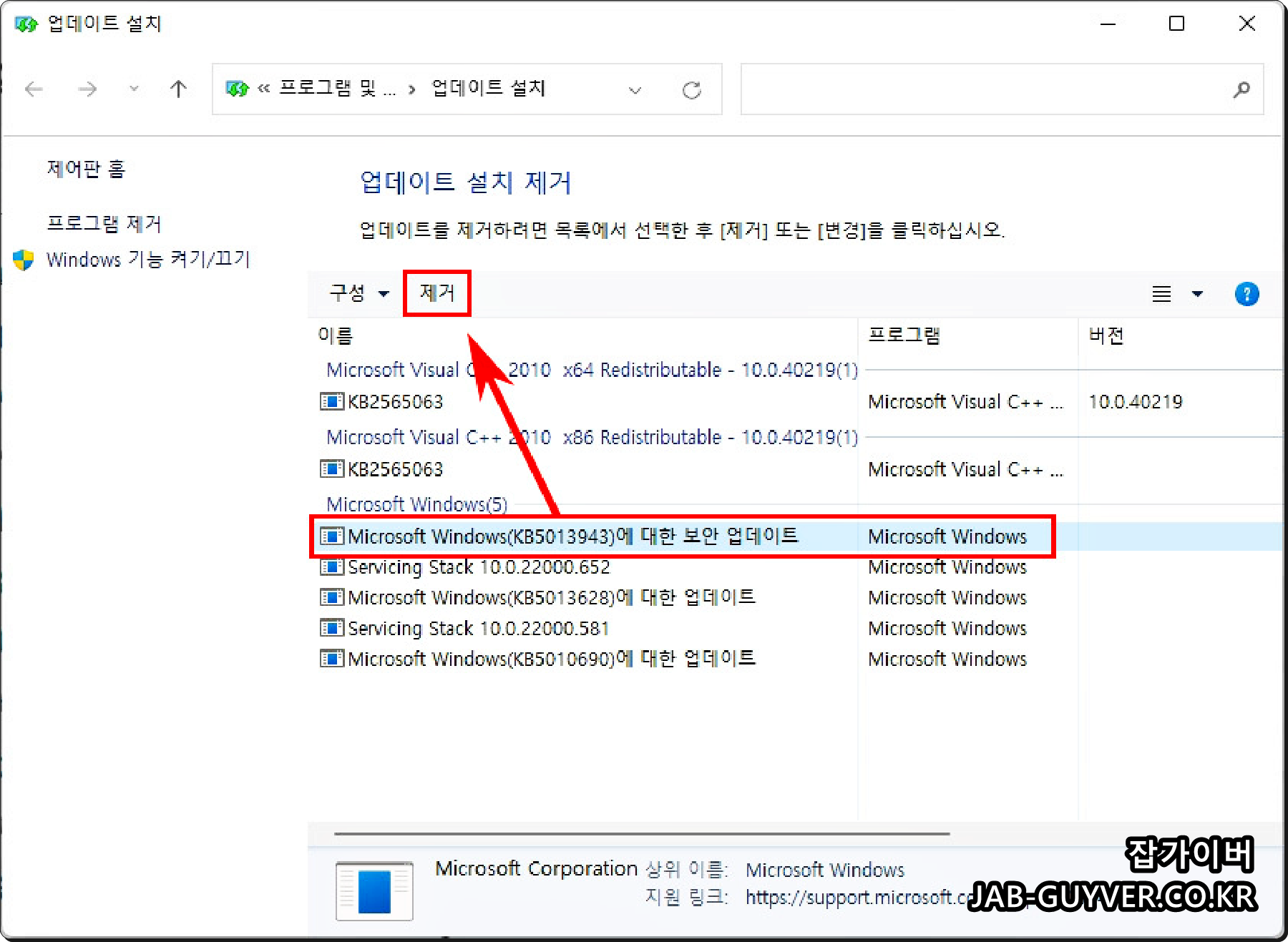 문제가 되는 업데이트를 클릭하여 강조 표시한 다음 목록 위에서 '제거'를 클릭합니다.