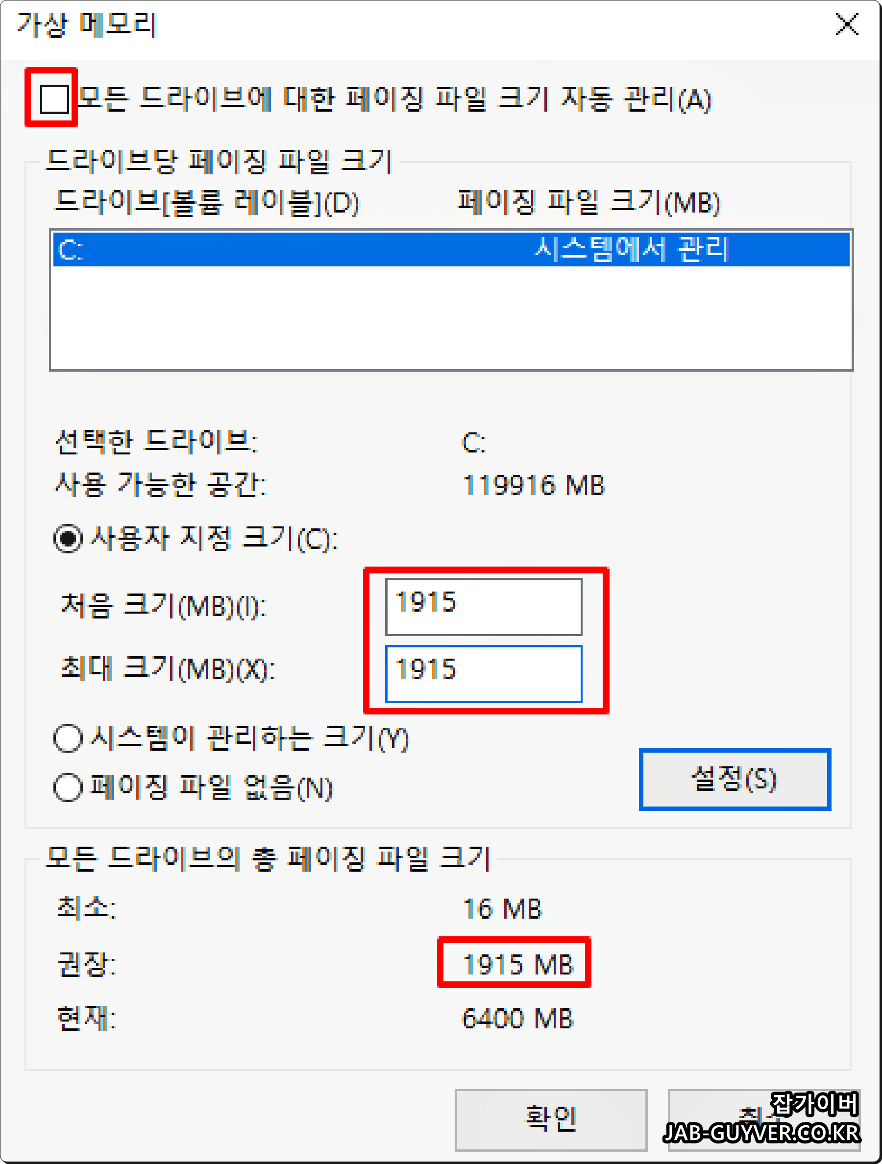 가상메모리 변경을 통해 사용자 지정크기를 권장하는 용량으로 메모리양을 증설해줍니다.