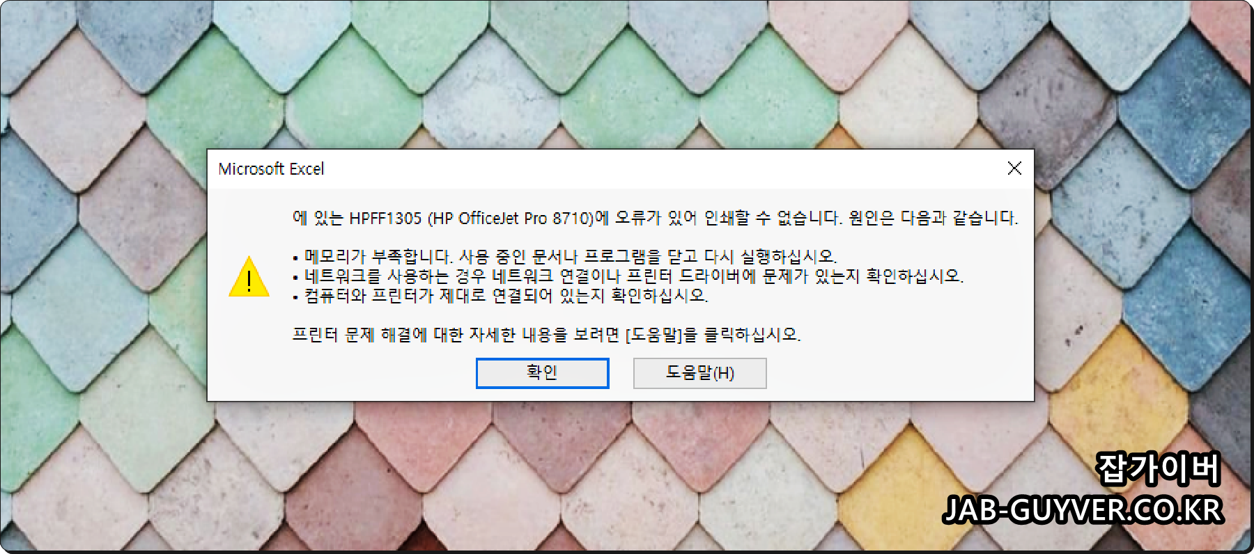 프린터로 엑셀 인쇄를 진행 시 프린터 모델명 "HPFF1305 (HP Officejet Pro 8170)에 오류가 발생했으며 해당 오류의 원인은 대표적으로 3가지로 보여집니다.