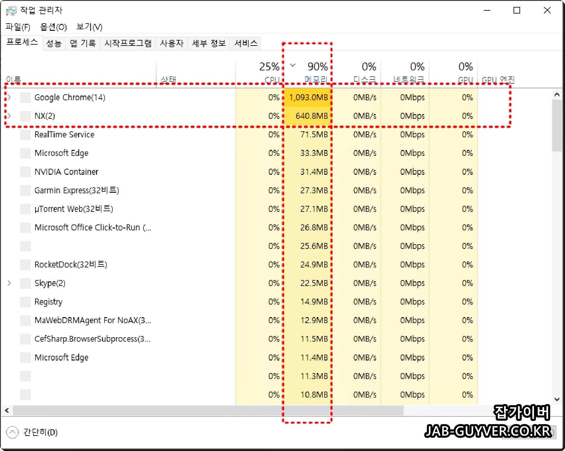 현재 실행 중 앱 중에서 메모리 및 CPU, 그래픽카드 등 사용량이 높은 프로그램을 확인 후 강제로 작업을 끝냅니다.