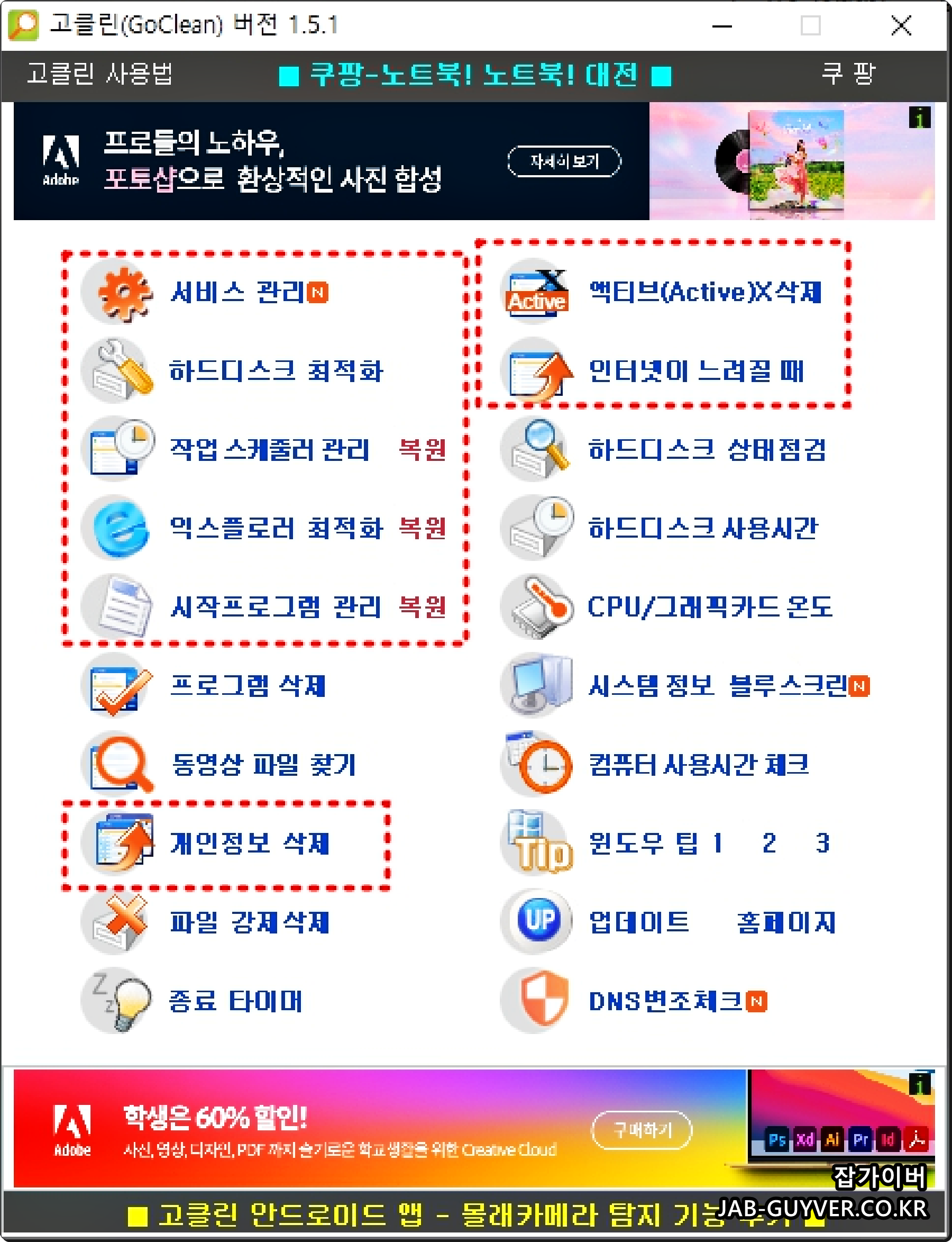 그 외에 고클린이나 CCeaner 등 윈도우 최적화 프로그램을 설치해서 작업 스케쥴러 및 익스플로러 최적화 등을 해 컴퓨터에 필요업는 찌꺼기 파일등을 정리해 용량을 늘려줍니다.