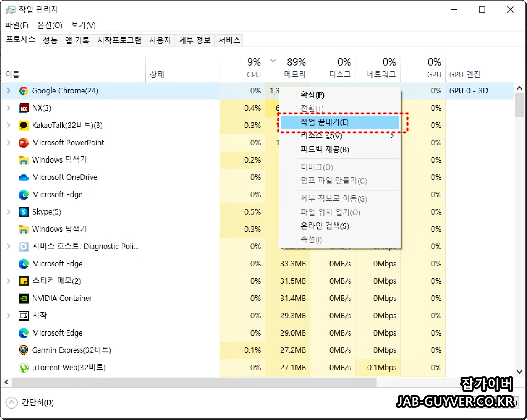 현재 실행 중 앱 중에서 메모리 및 CPU, 그래픽카드 등 사용량이 높은 프로그램을 확인 후 강제로 작업을 끝냅니다.
