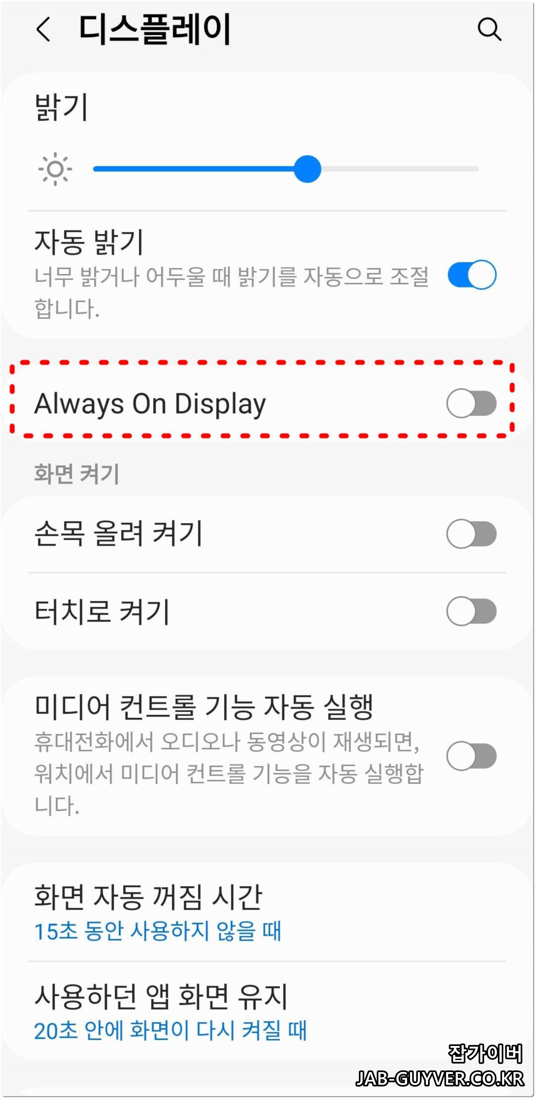 다만 AOD(항상 디스플레이 켜기) 사용 시 야외에서는 밝기가 부족하게 느껴질 수 있으며, 이 경우 절전모드나 배터리 상태도 함께 확인해야 합니다.