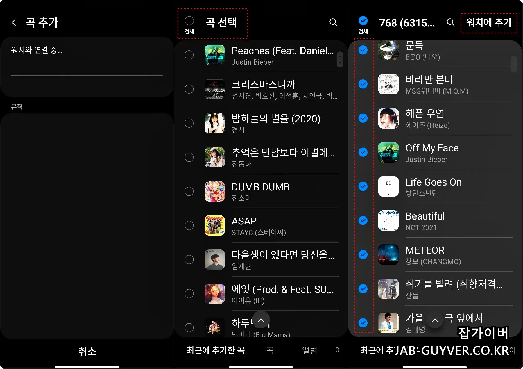 곡추가를 선택하면 핸드폰에 있는 MP3 파일이 보여지며 여기서 갤럭시워치로 전송할 음악파일을 선택 후 워치에 추가를 눌러줍니다.