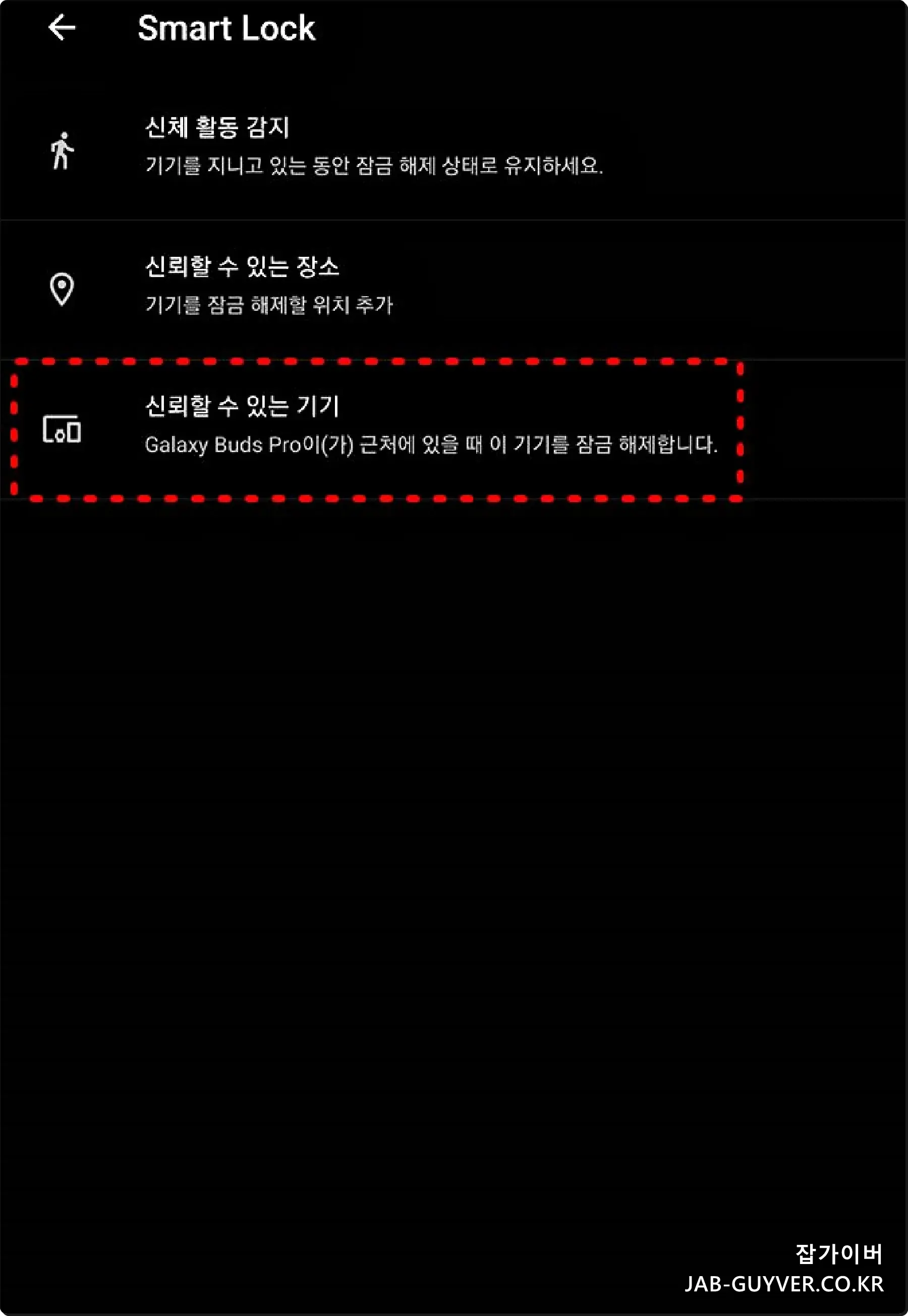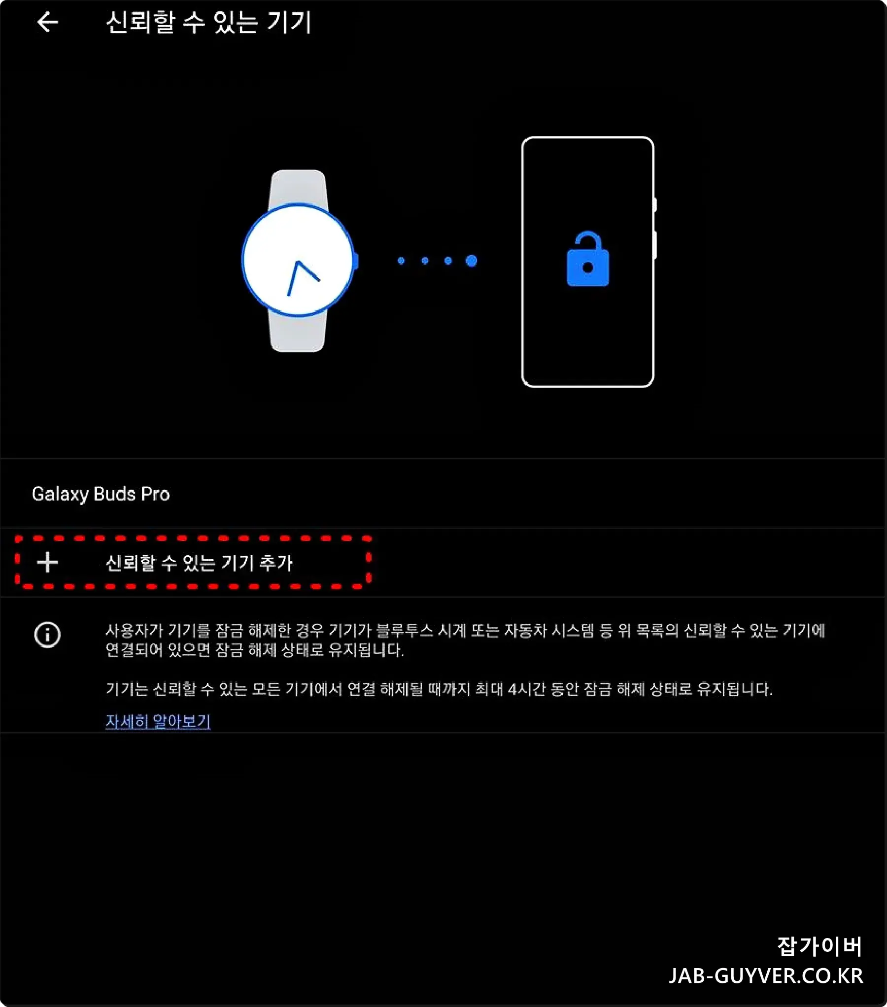 신뢰할 수 있는 기기추가를 통해 갤럭시워치나 갤럭시버즈등을 연동하면 웨어러블 기기를 사용 중에는 핸드폰 잠금화면이 자동으로 해제됩니다.