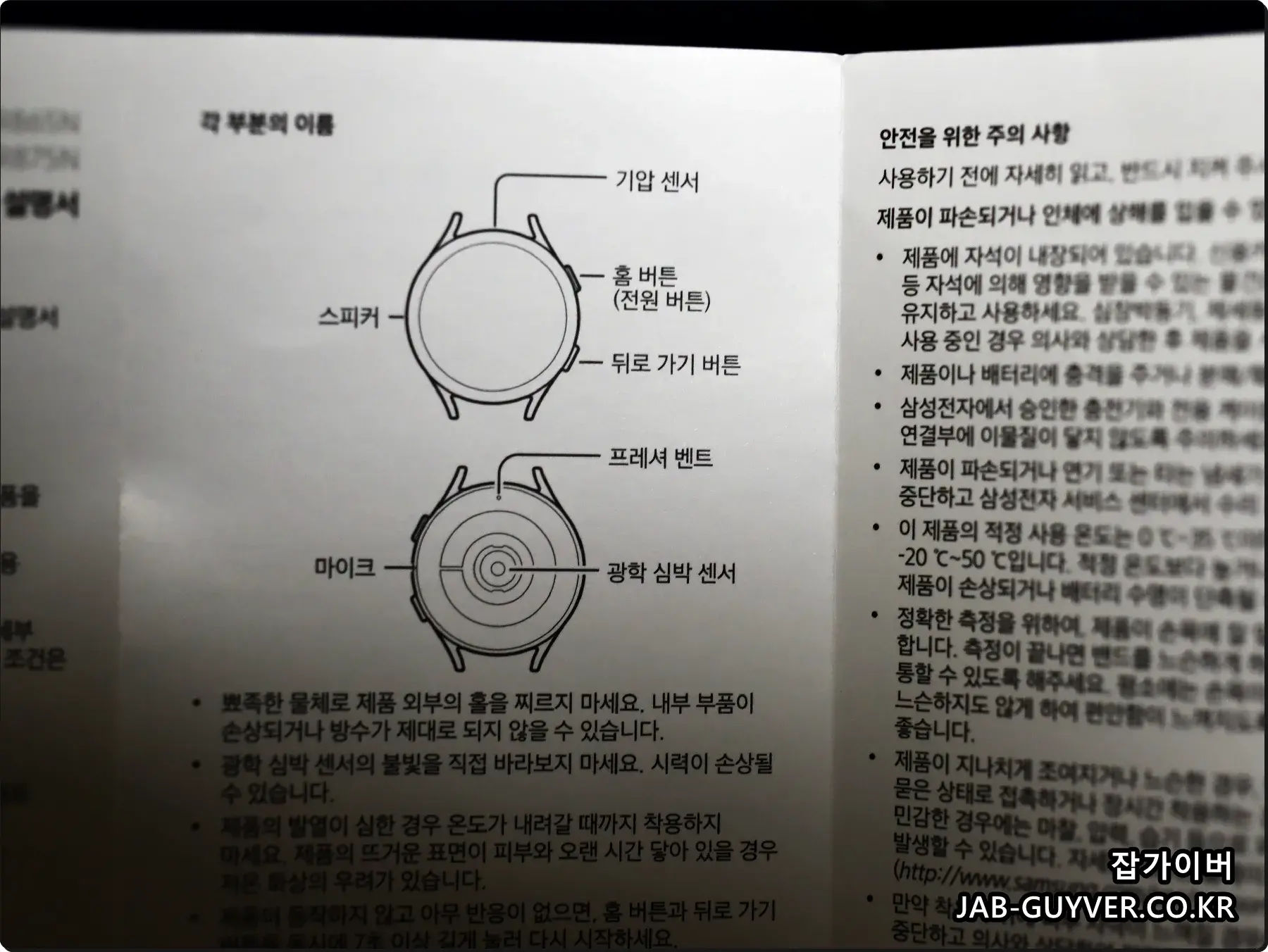 그 외 전원버튼과 뒤로가기버튼, 프레셔벤트, 광학 심박센서등이 있으며 이 부분이 손상되지 않도록 주의합