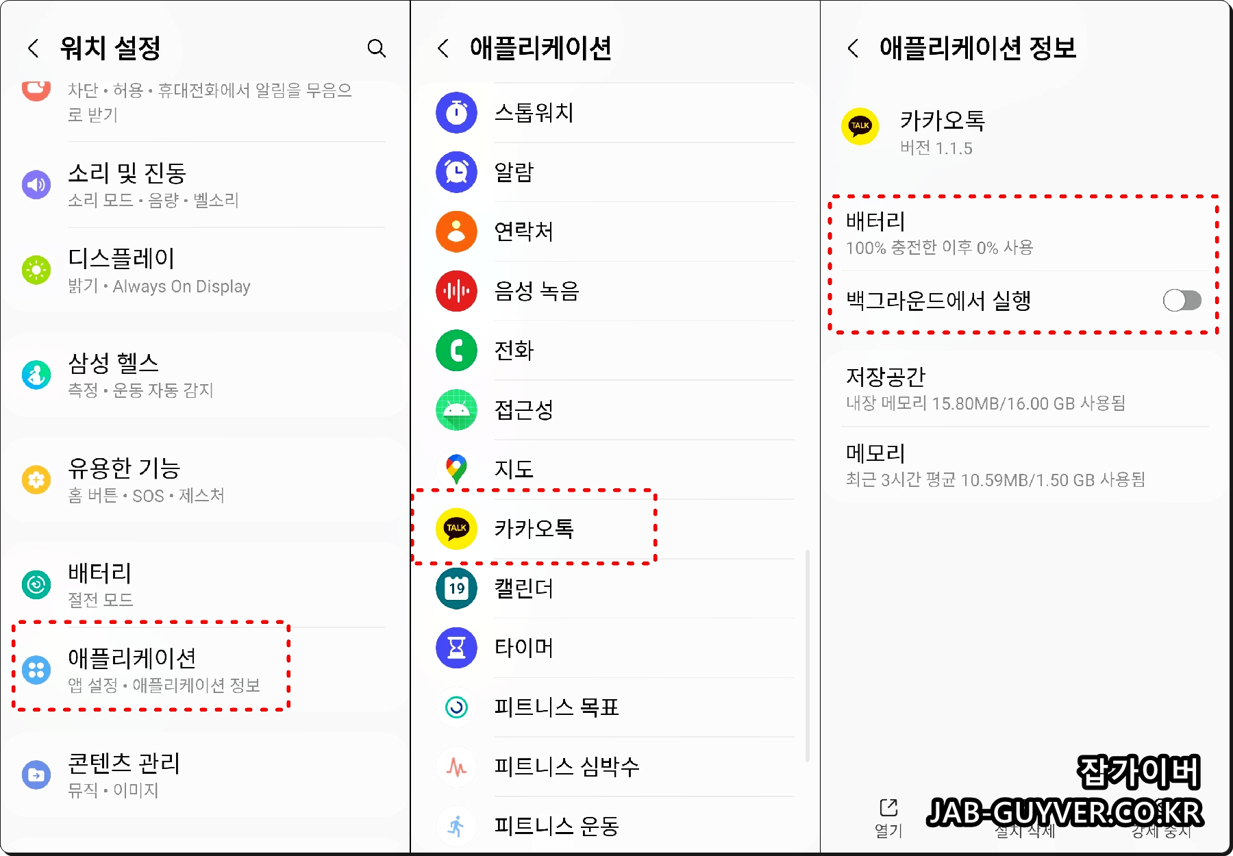 카카오톡 배터리가 많이 소모되거거나 백그라운드 실행을 끄고 싶다면 핸드폰 앱설정에서 카카오톡 애플리케이션 정보를 변경합니다.