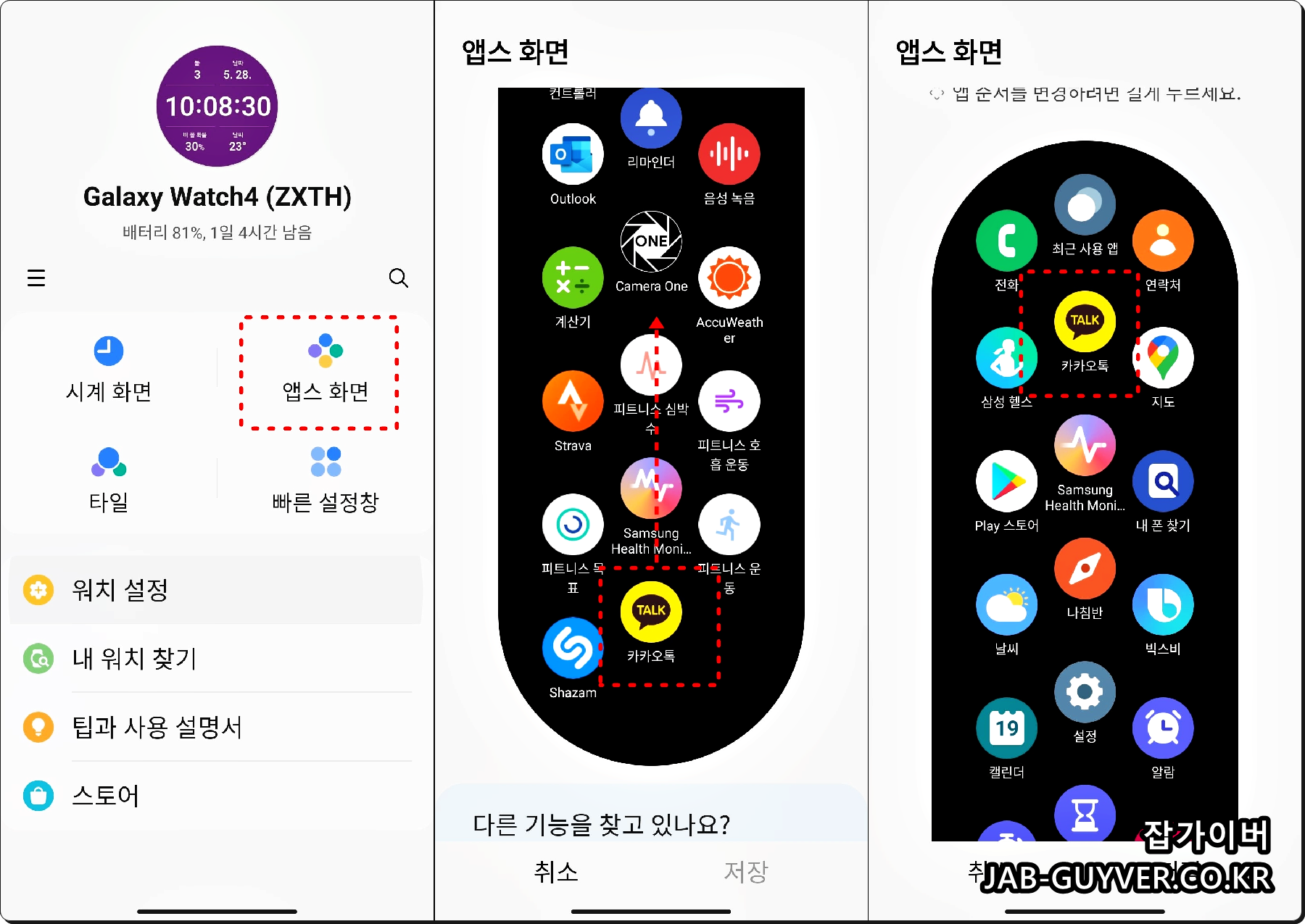 카카오톡 앱이 워치 앱 맨 밑에 있는게 싫다면 갤럭시웨어러블 앱 -> 앱스화면에서 워치 앱스화면 위치를 변경해줍니다.