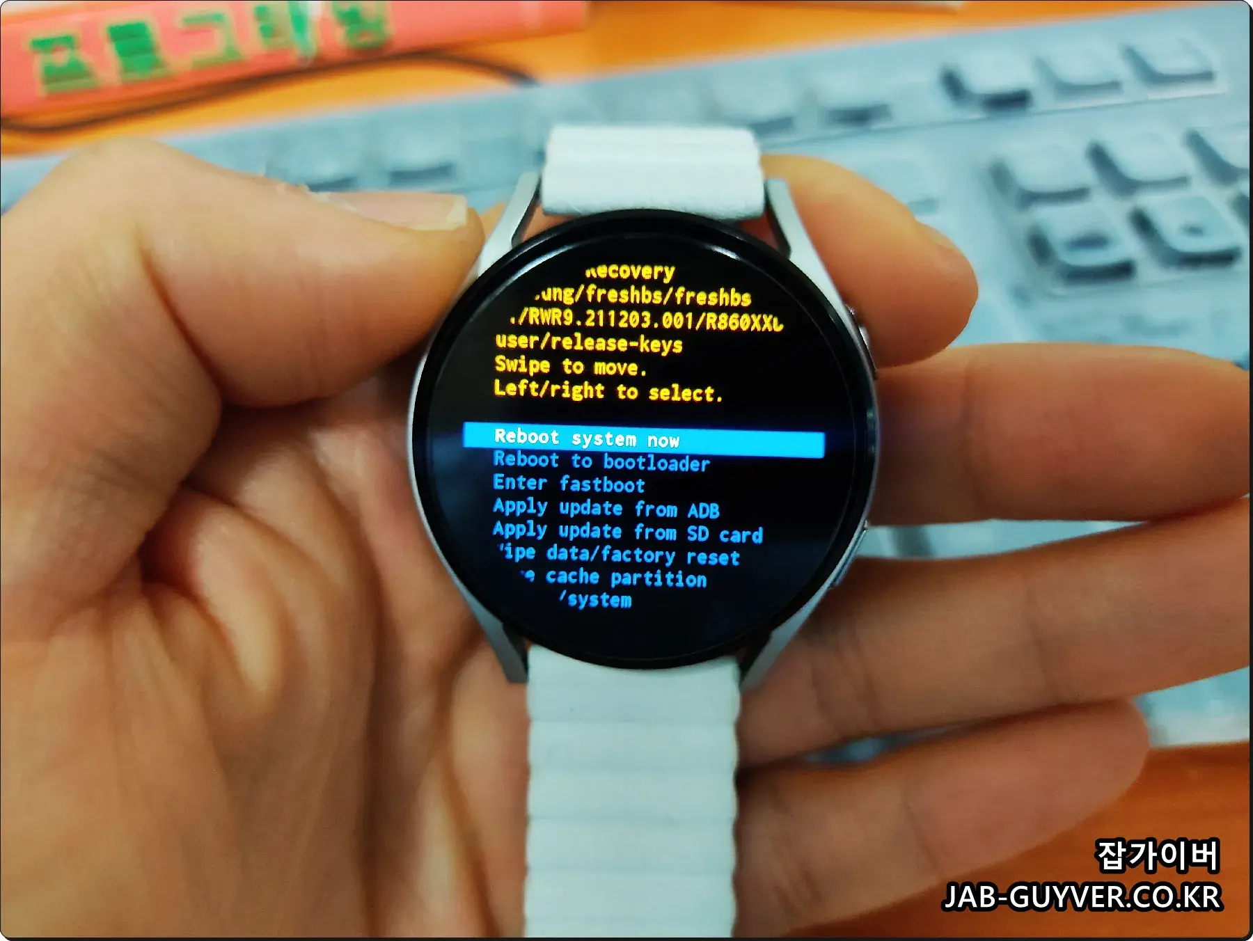 전원이 꺼져있는 상태에서 갤럭시워치5 부팅 중 Samsung 로고 밑에 Rebooting 로고가 실행되는데 이때 빠르게 상단버튼 2번 눌러줍니다.