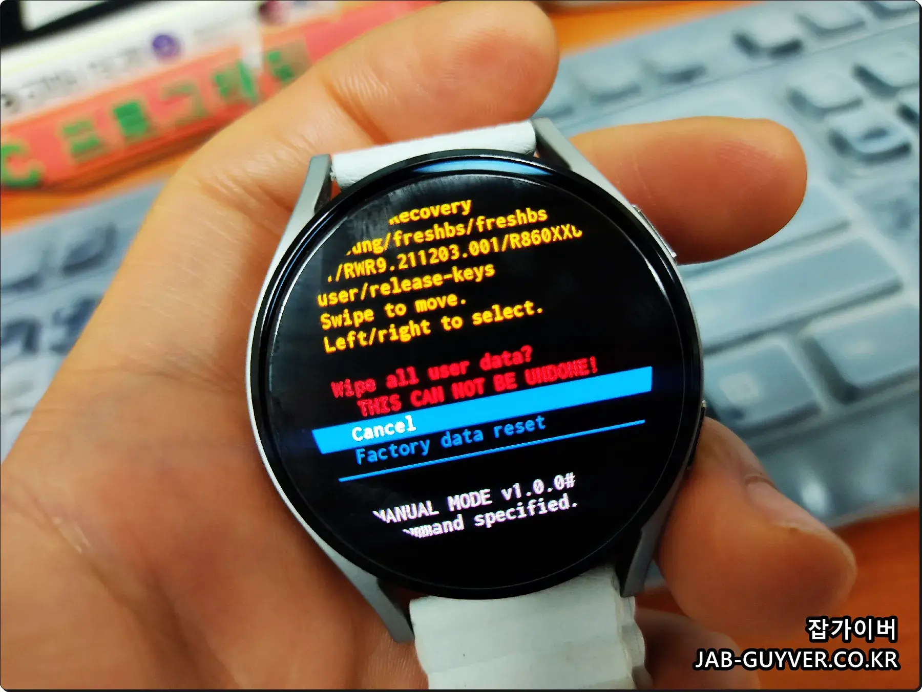 | 강제 공장초기화 (Recovery 모드) | 전원 OFF → 두 버튼 동시에 길게 누름 → Rebooting 화면에서 상단 버튼 2회 누름 → Wipe Data / Factory Reset 선택 | 워치 부팅 불가, 벽돌 상태 | 먹통, 재부팅 불가, 중고 판매 시 강제 리셋 필요 | 시스템 레벨 초기화, 데이터 완전 삭제, 복구모드 진입 필수 |