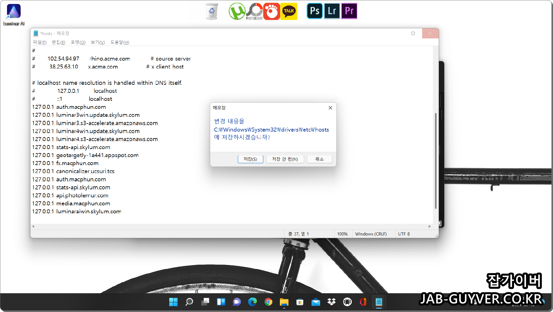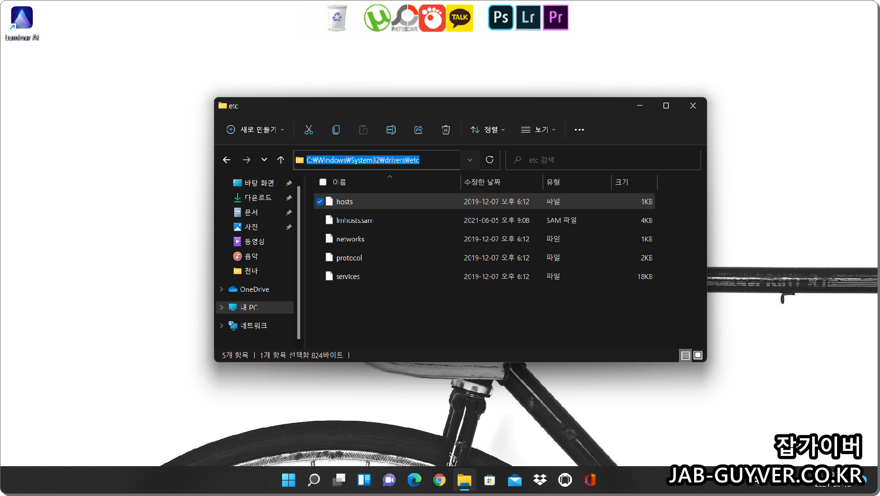 만약 HOST 파일이 권한부족으로 수정 후 저장이 되지 않는다면 해당파일을 바탕화면으로 복사해서 HOST 파일을 수정합니다.