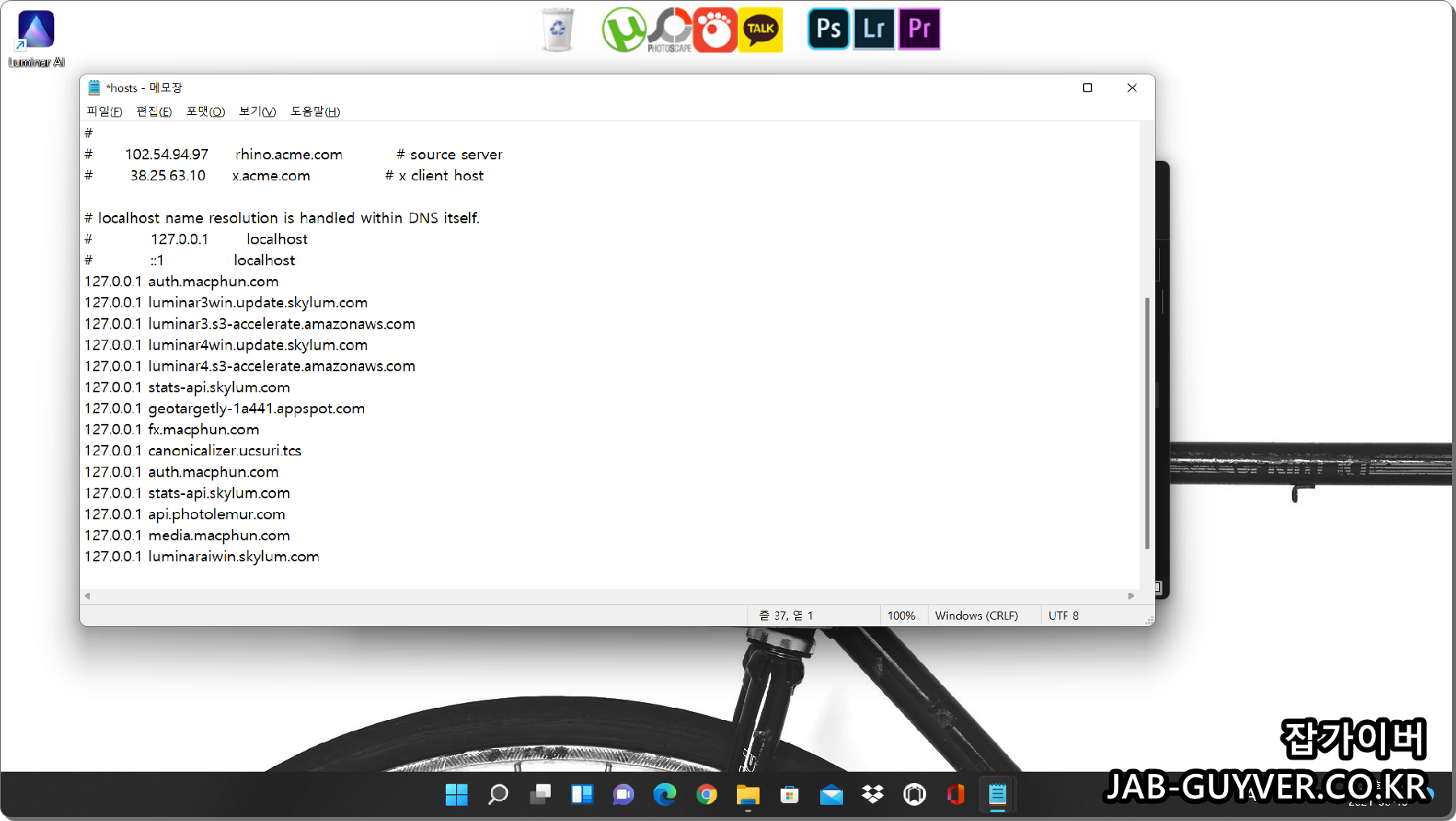 해당 폴더로 이동 후 HOST 파일을 메모장으로 실행해서 가장 하단에 아까 복사한 코드를 붙여넣기하고 저장합니다.