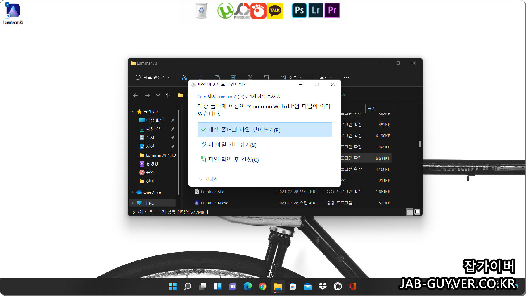 마지막으로 Crack 폴더에 있는 루미나르AI 크랙파일인 “Common.Web.DLL“파일을 설치된 경로에 붙여넣기합니다.