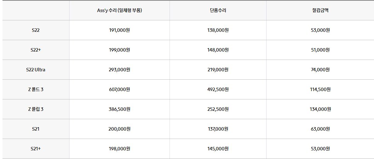 갤럭시s22 s21 z플립3 노트 액정 배터리 카메라 충전단자 교체비용