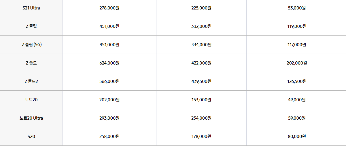 | 갤럭시Z 플립3 | 386,500원 | 252,500원 | 134,000원 |