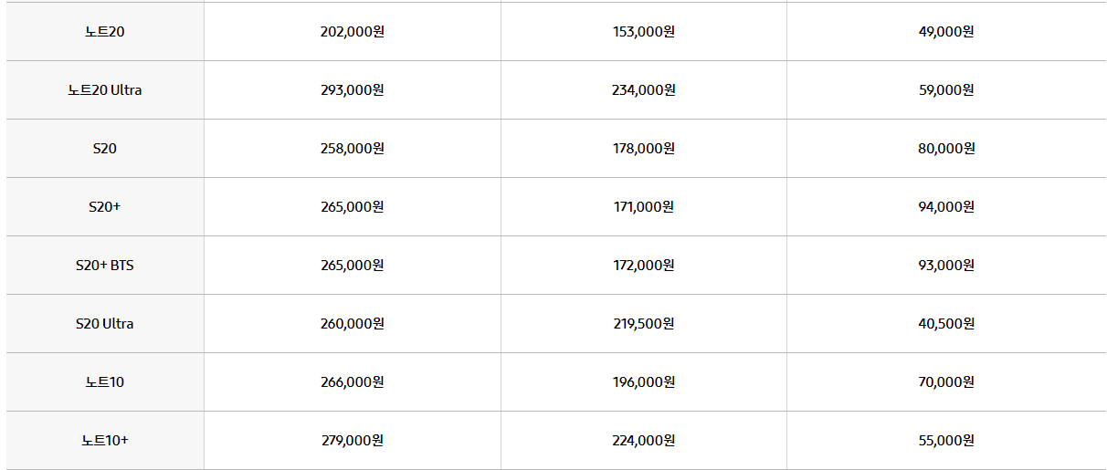 | 갤럭시노트20 | 202,000원 | 153,000원 | 49,000원 |