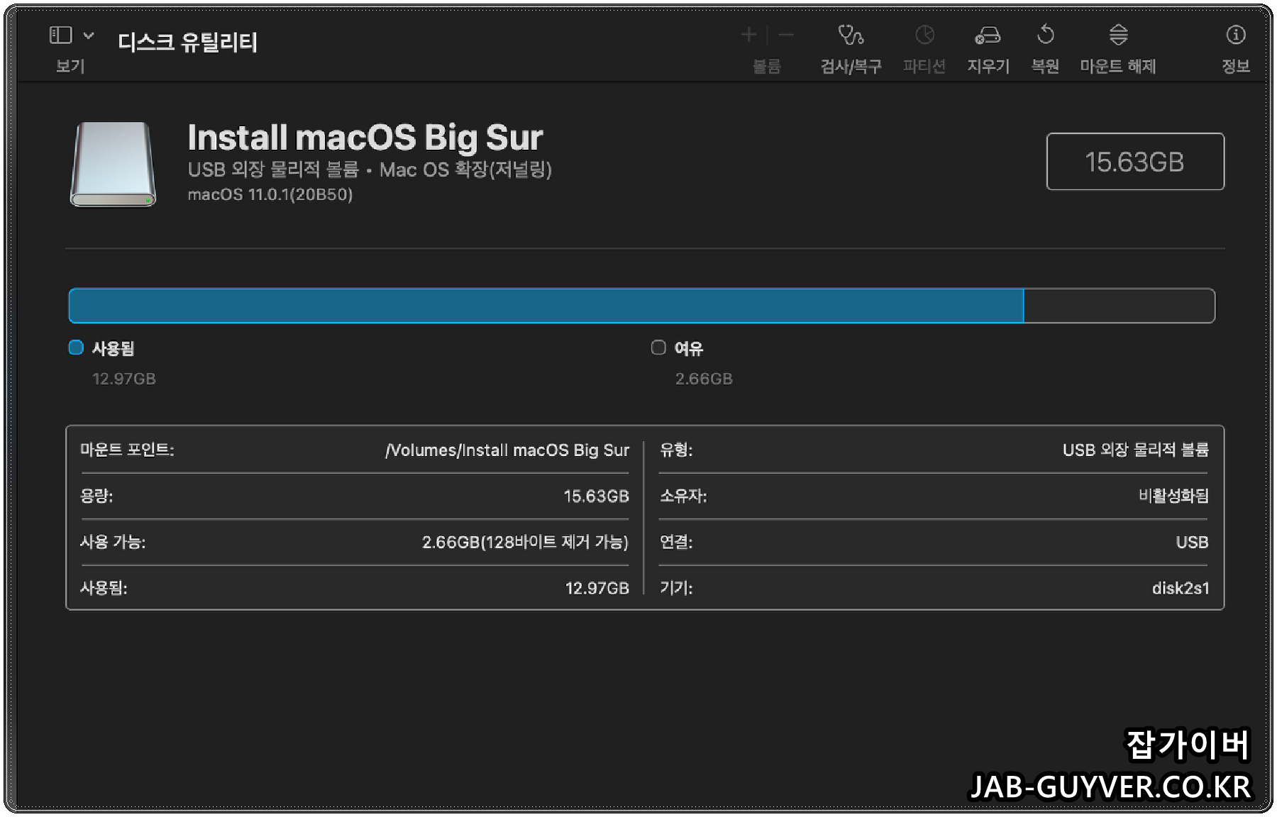 이때 마지막 USB 볼륨이름은 포맷 시 입력된 파티션 이름입니다. 아래는 벤츄라/몬테레이 외 버전에서 흔히 쓰는 명령입니다.