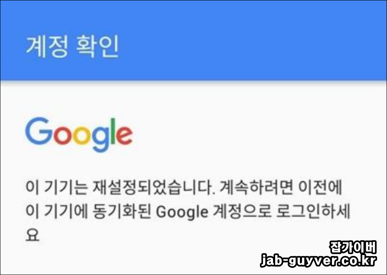 갤럭시 공장초기화 이기기는 재설정되었습니다 구글계정 잠김 안드로이드기반의 스마트폰인 갤럭시,갤럭시노트등을 사용하면서 공장초기화 후 구글계정을 로그인하게되면 오류가 발생하는경