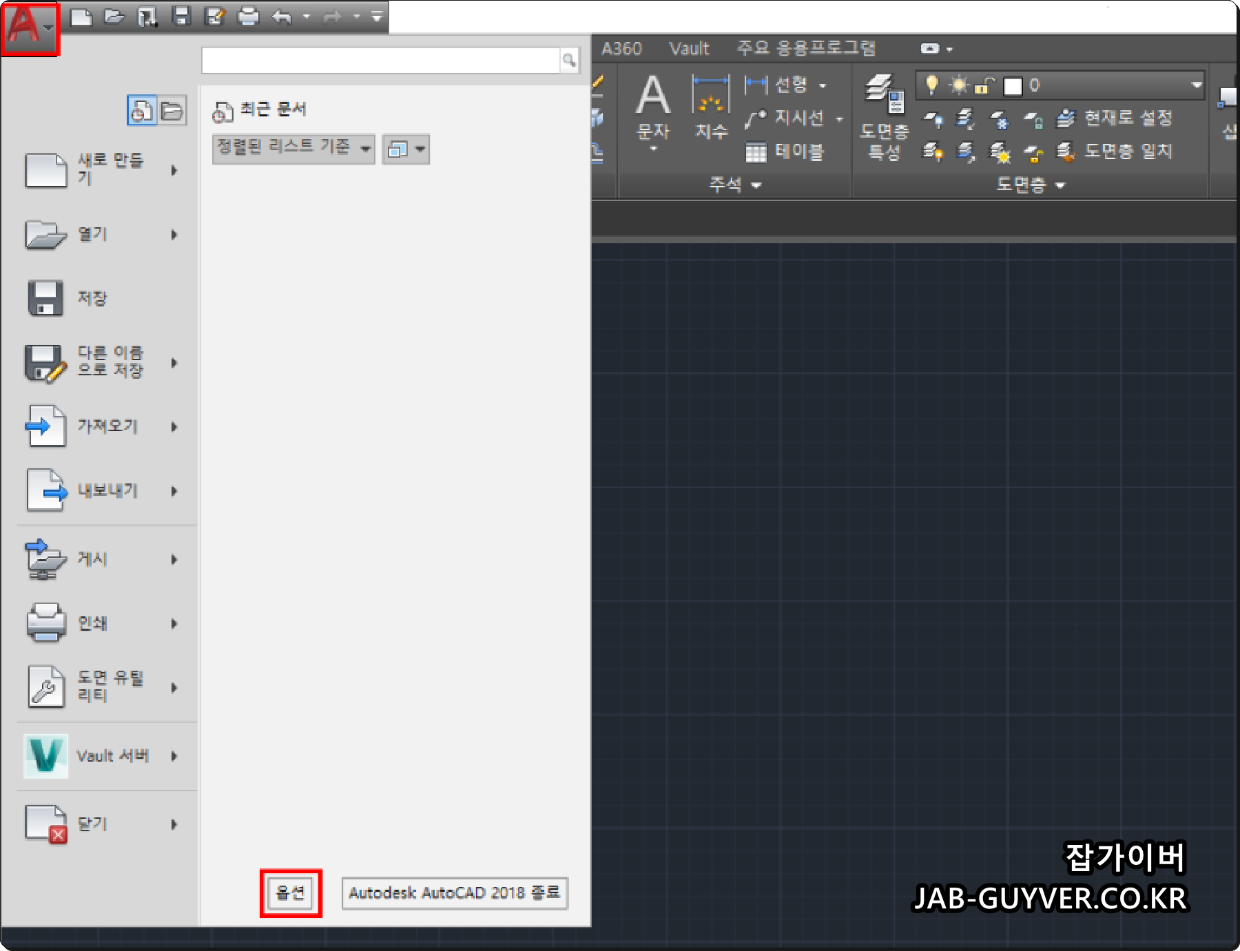 오토캐드 저장설정을 변경하고자 한다면 좌측상단 A로고를 선택 해 옵션을 선택합니다.