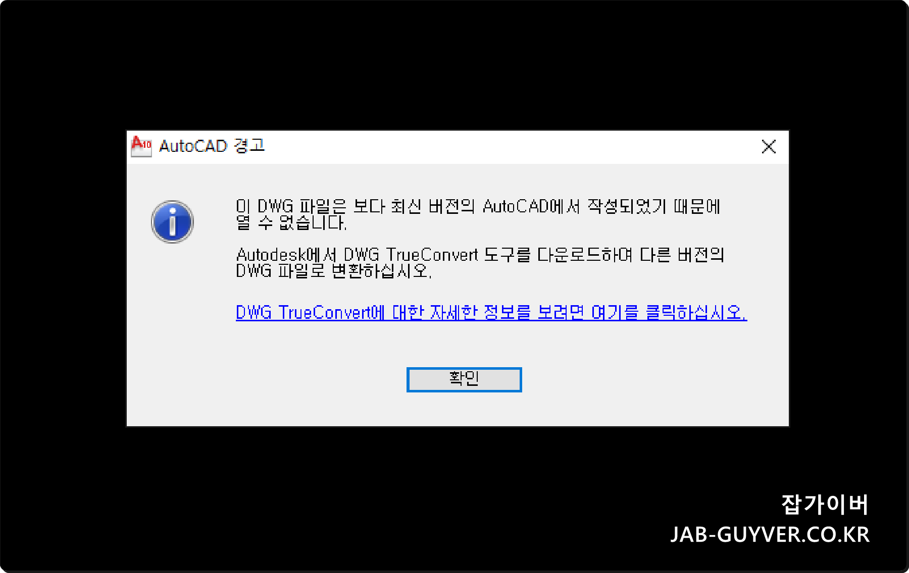 최신버전으로 작업된 오토캐드는 하위버전 오토캐드에서는 파일을 열 수 없기 때문에 보느것과 같이 이 DWG 파일은 보다 최신 버전의 Autocad에서 작성되었기 때문에 열 수 없습니다.