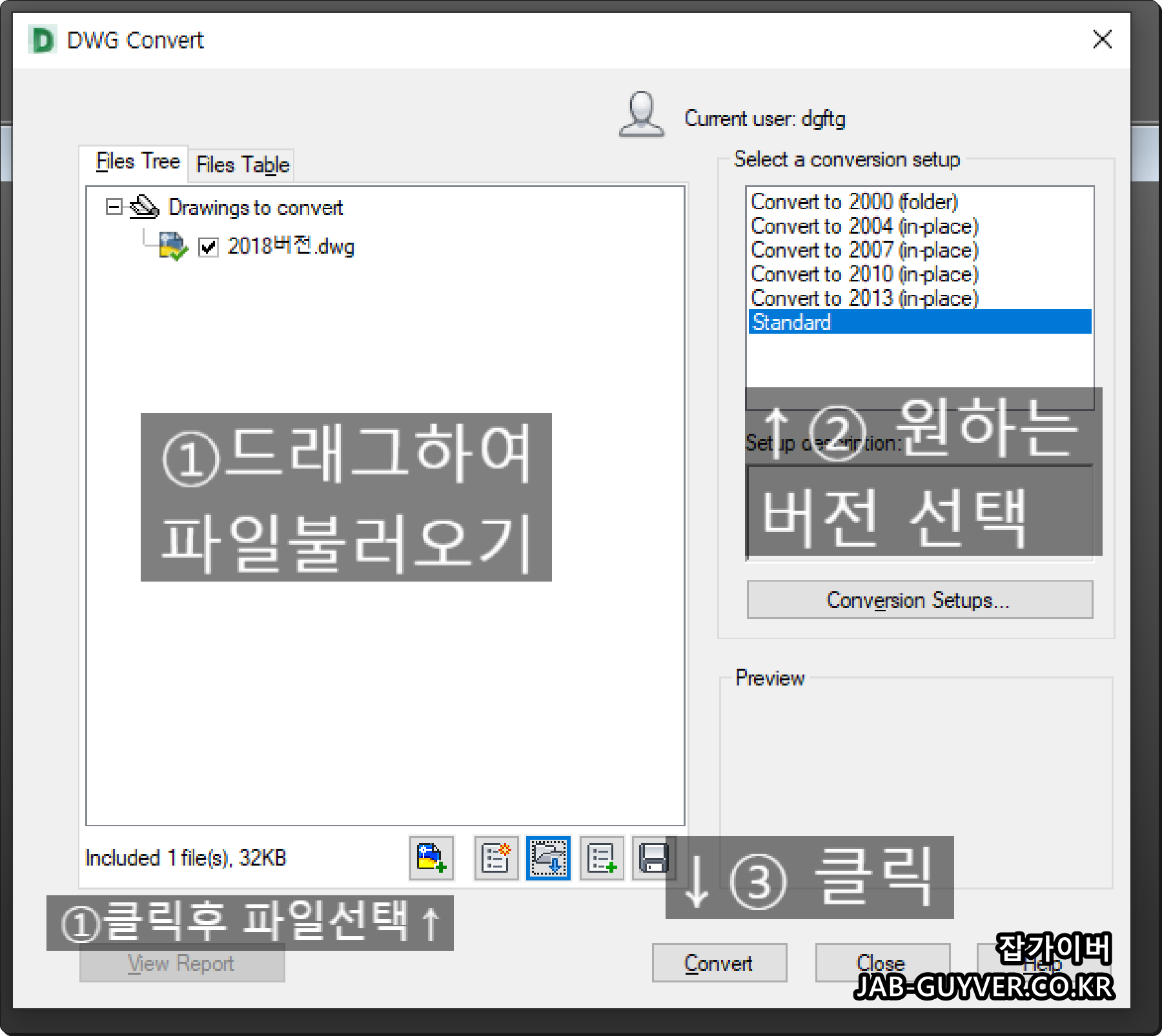 DWG Convert를 실행해서 변환하고자 하는 dwg 도면을 불러와 원하는 버전을 선택하면 파일변환이 가능합니다.