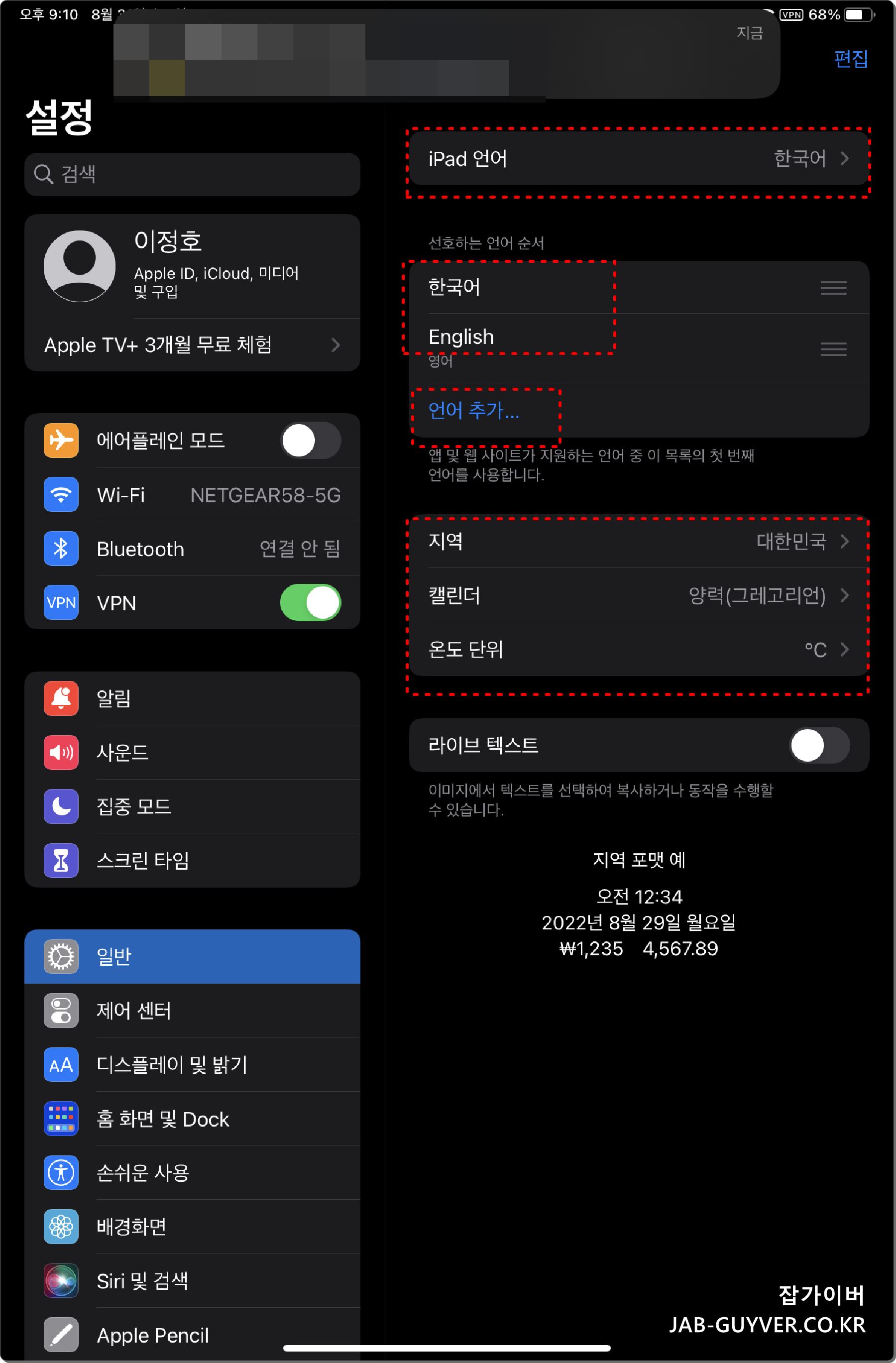 그 외 자잘하게 아이패드 언어 및 지역, 온도단위 등이 가능합니다.