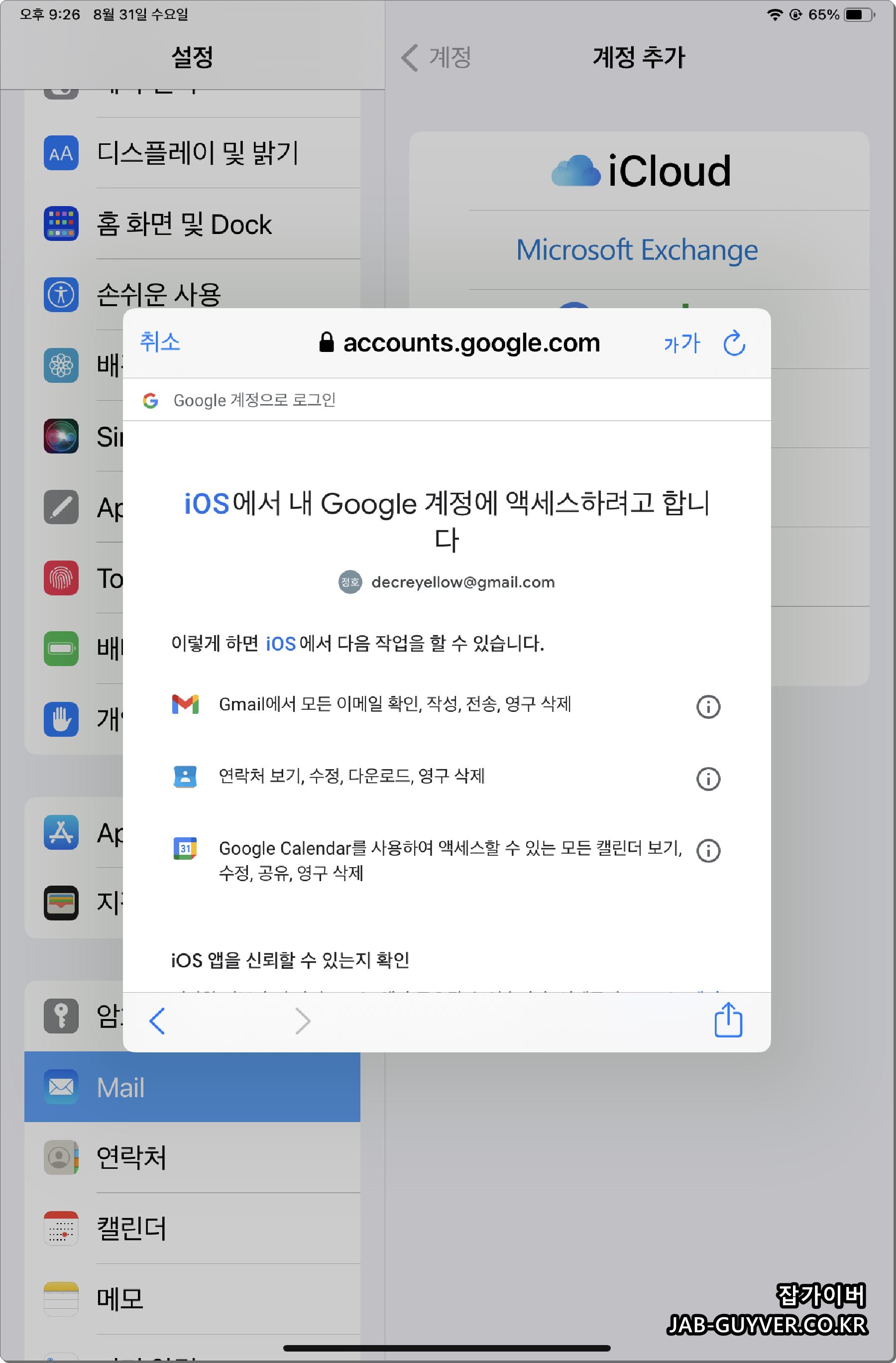 구글의 지메일을 추가하는 경우 계정연동 후 iOS 계정에 엑세스를 허용합니다.