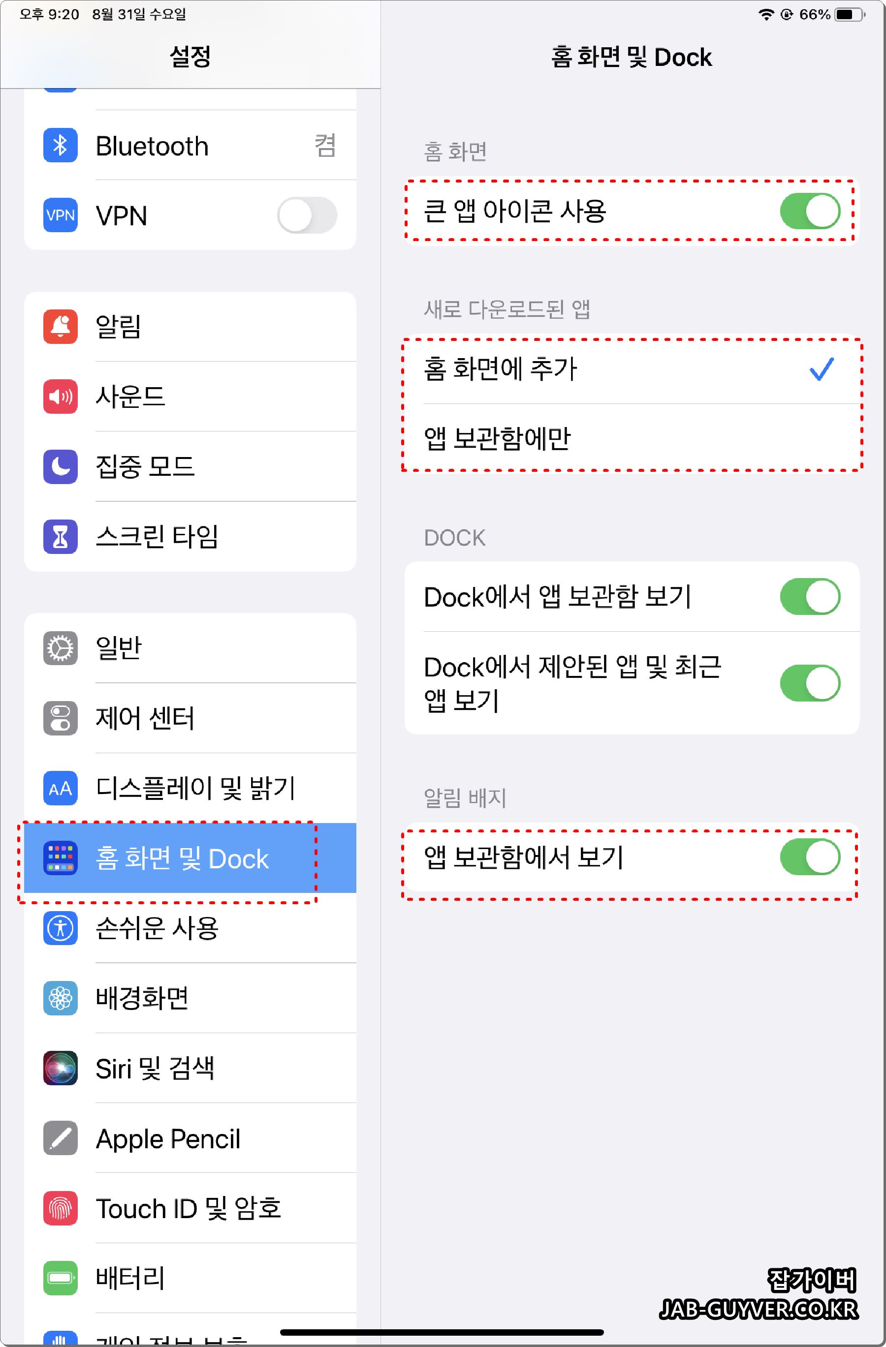 홈 화면 및 Dock 설정에서 큰 앱 아이콘을 사용하는것이 편리합니다.