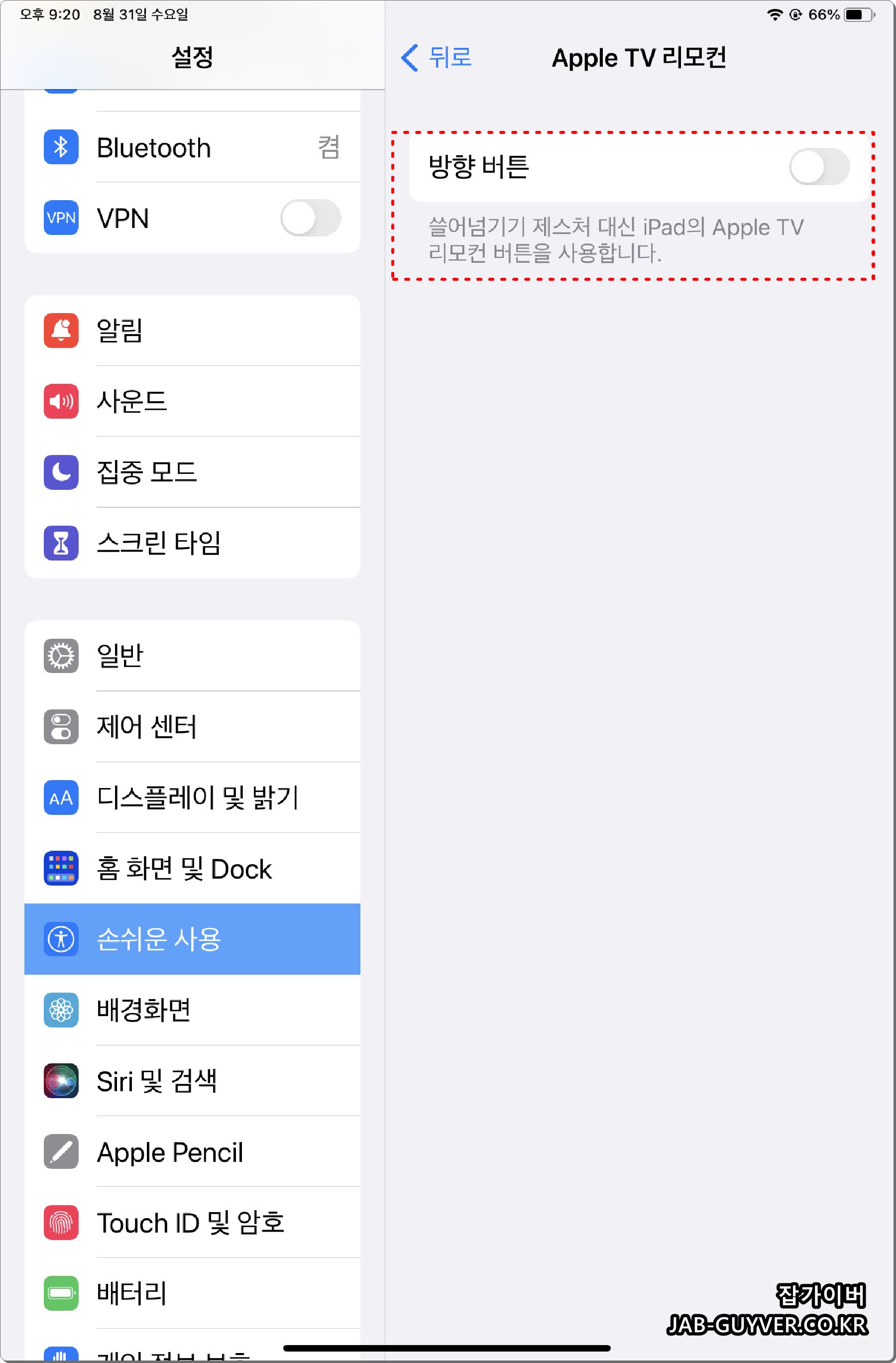 손쉬운 사용에서 필요한 기능은 AssistiveTouch 기능으로 이 기능을 활성화해서 아이패드에 터치 버튼을 추가해서 원하는 기능을 추가합니다.