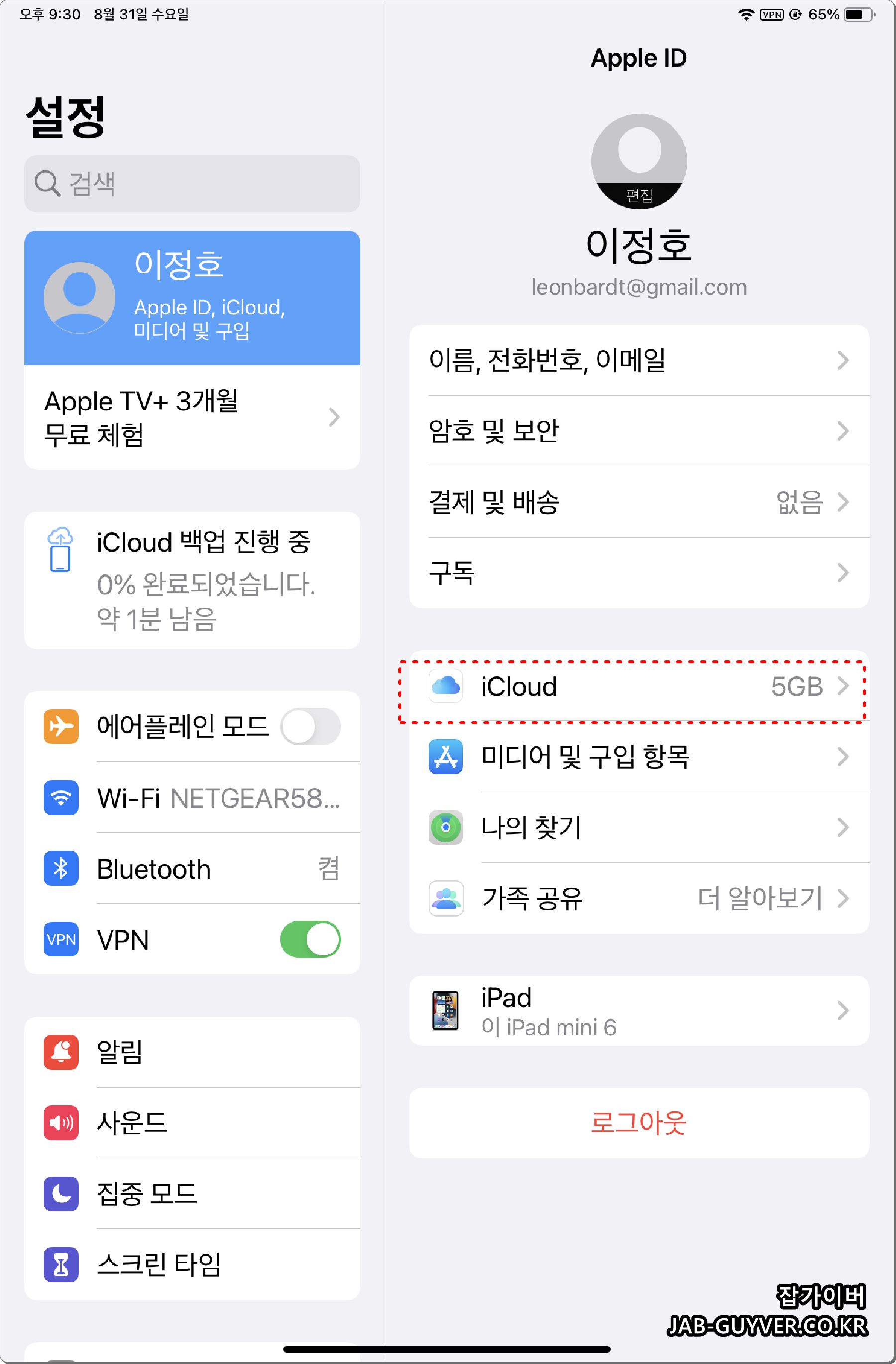아이패드 설정으로 들어가면 기본적인 개인정보와 아이클라우드 백업 등이 가능합니다.