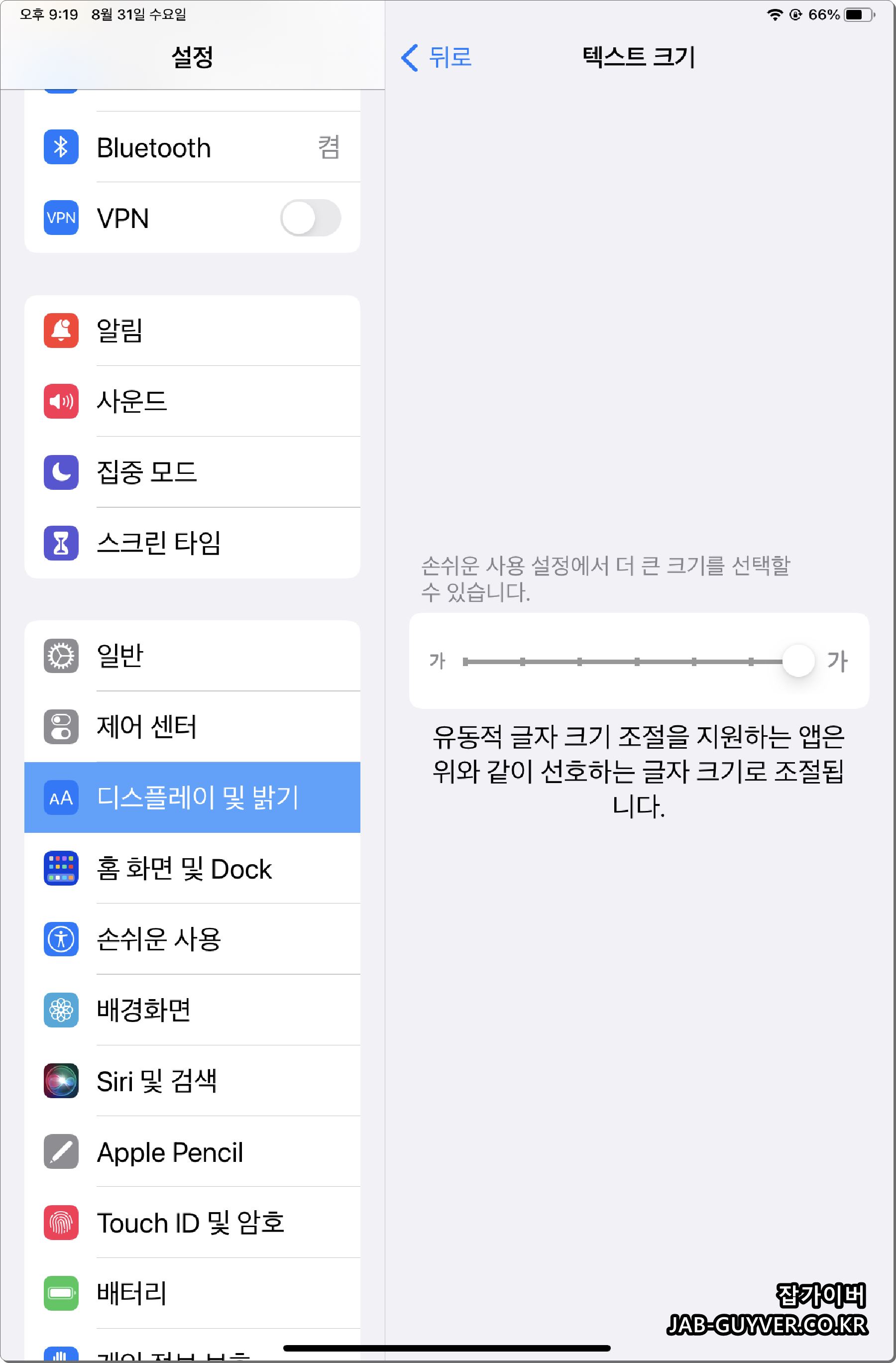 특히 시력이 좋지 못해 아이패드 글씨크기는 최대로 해서 사용하며 필요에 따라 글씨 크기를 조절합니다.