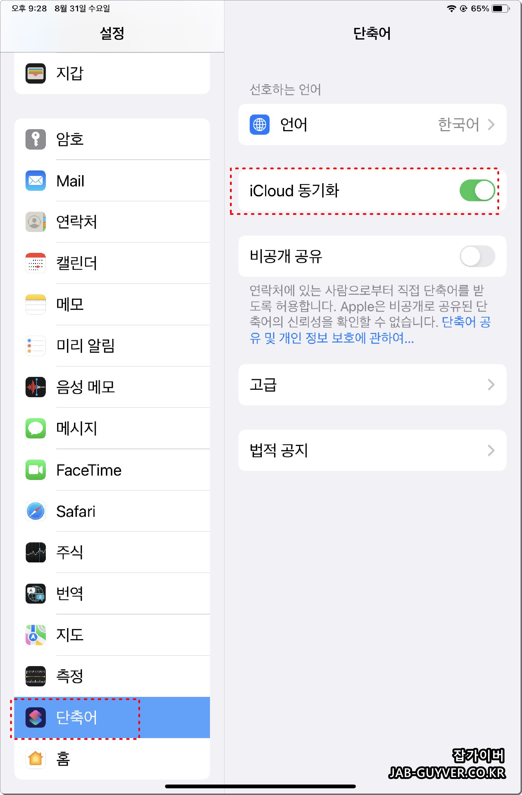 그 외에도 필요한 도서, 페이지, 키노트, 단축어, 날시, 아이무브 편집 등 동기화하고자 하는 설정으로 마무리합니다.