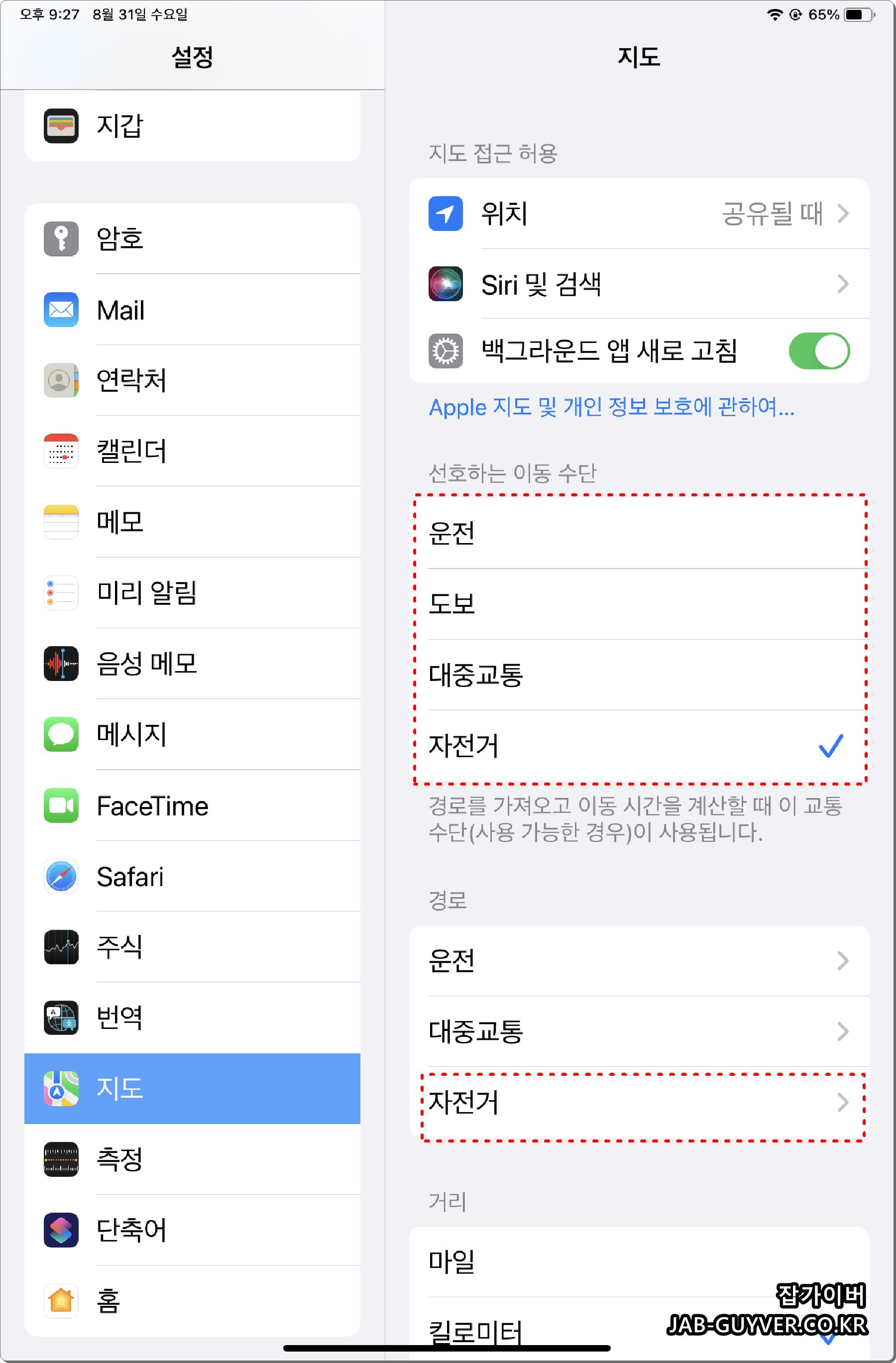 아이폰의 경우 자전거 이동경로를 표시하고 싶다면 자전거로 선택해도 되지만 아이패드의 경우 자전거 탑승보다는 운전자 네비게이션 및 대중굩오에 주로 적합합니다.