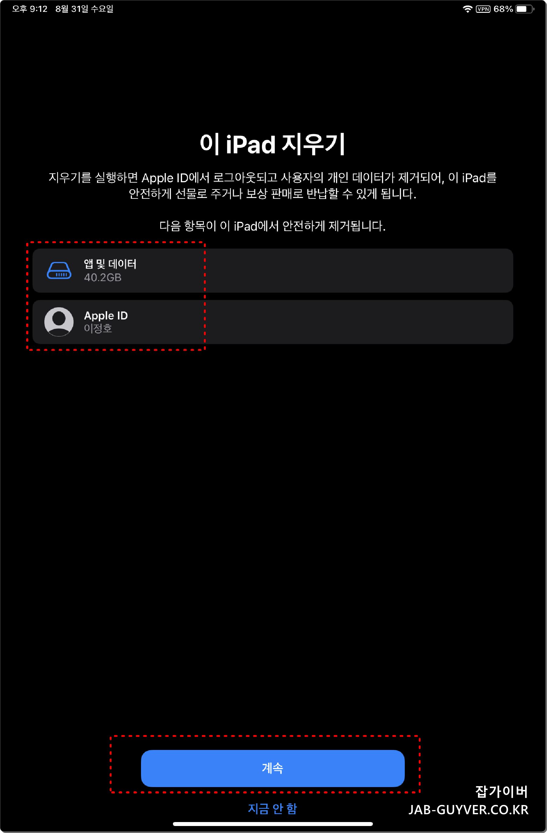 아이패드 데이터를 모두 삭제 후 초기화를 하기 전 기존에 연결된 애플계정 및 앱 용량을 확인합니다.