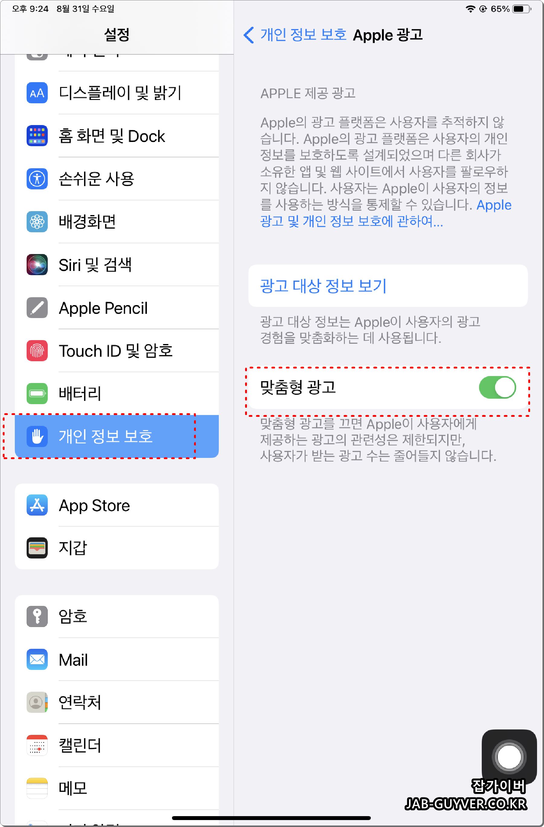 아이폰 및 아이패드는 구글 안드로이드 핸드폰과 같이 개인정보에서 맞춤형 광고로 자동표시되며 광고를 끄느것은 불가능