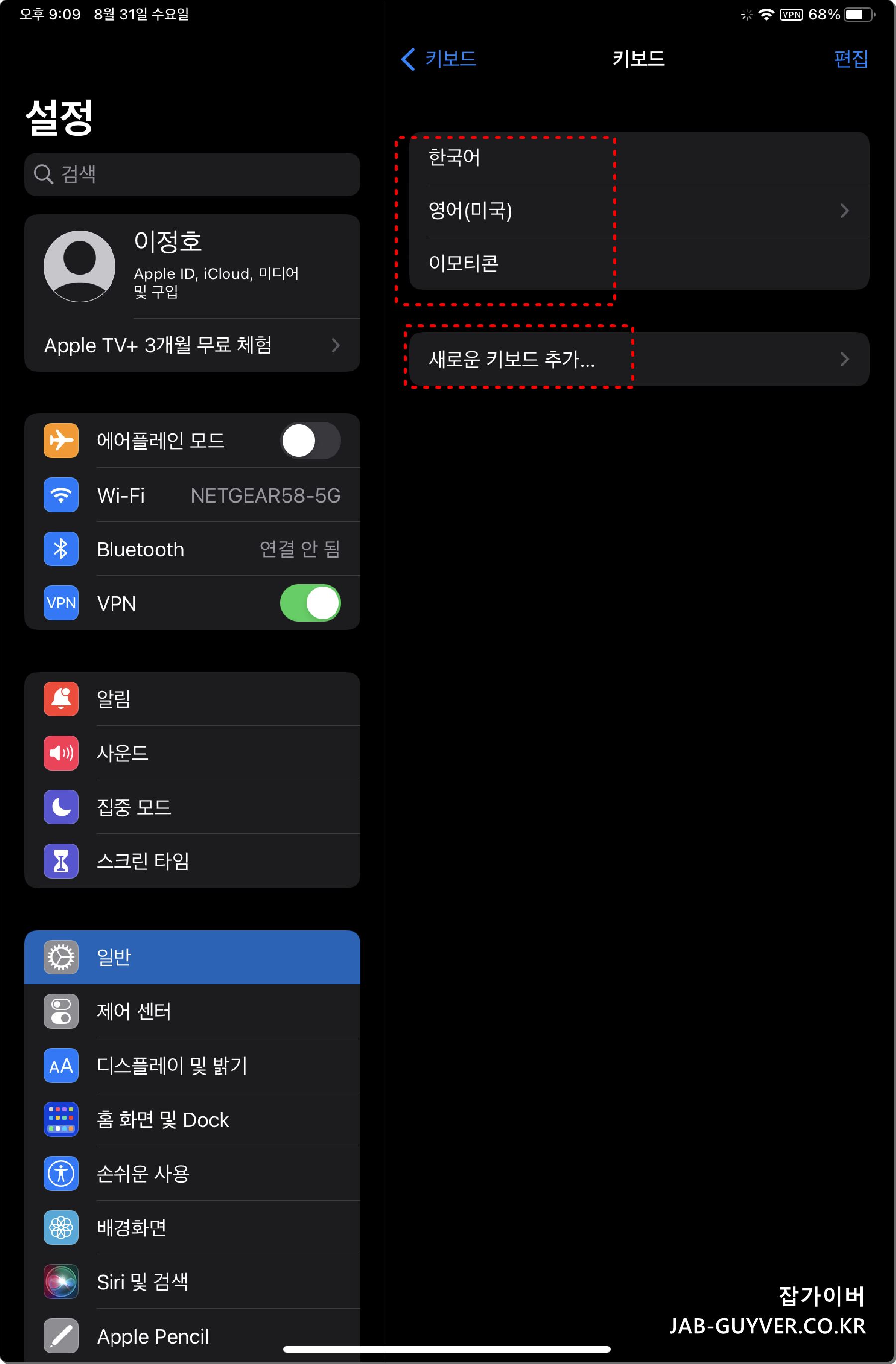 반대로 키보드에서 원치 않게 일본어 및 중국어등이 쳐진다면 키보드 설정에서 해당언어를 제거합니다.