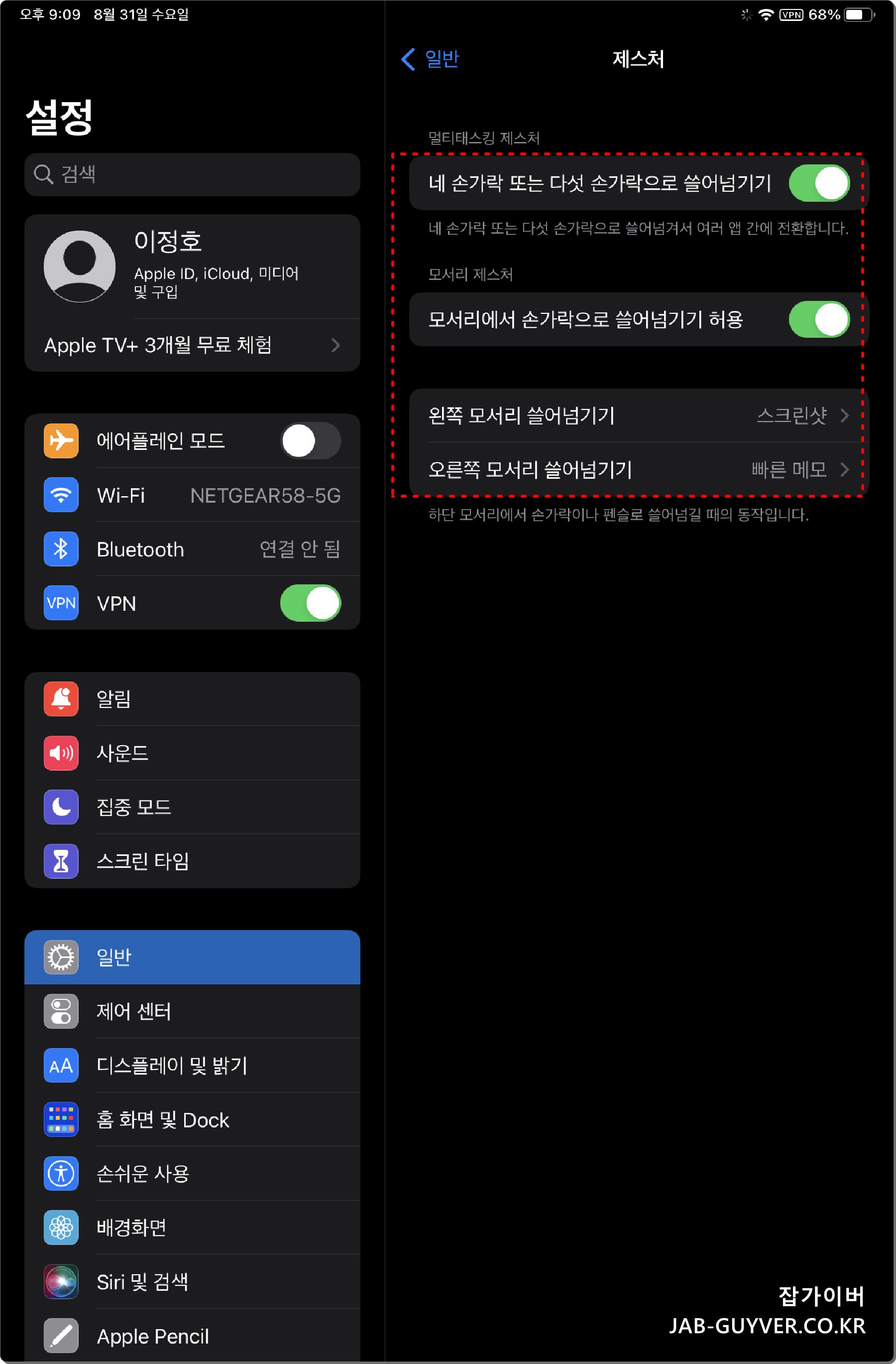 에어드롭 및 에어플레이, 날짜 및 시간변경과 키보드 제스처, 폰트크기,지역 VPN 설정등이 가능하고 마지막으로 아이패드 초기화도 가능합니다.