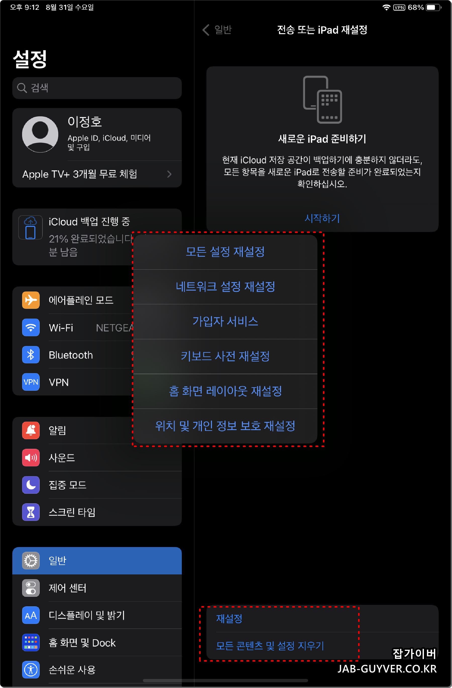 데이터 백업이 완료되었다면 아이패드 초기화를 진행하며 이때 제공되는 초기화 종류는 6가지입니다.