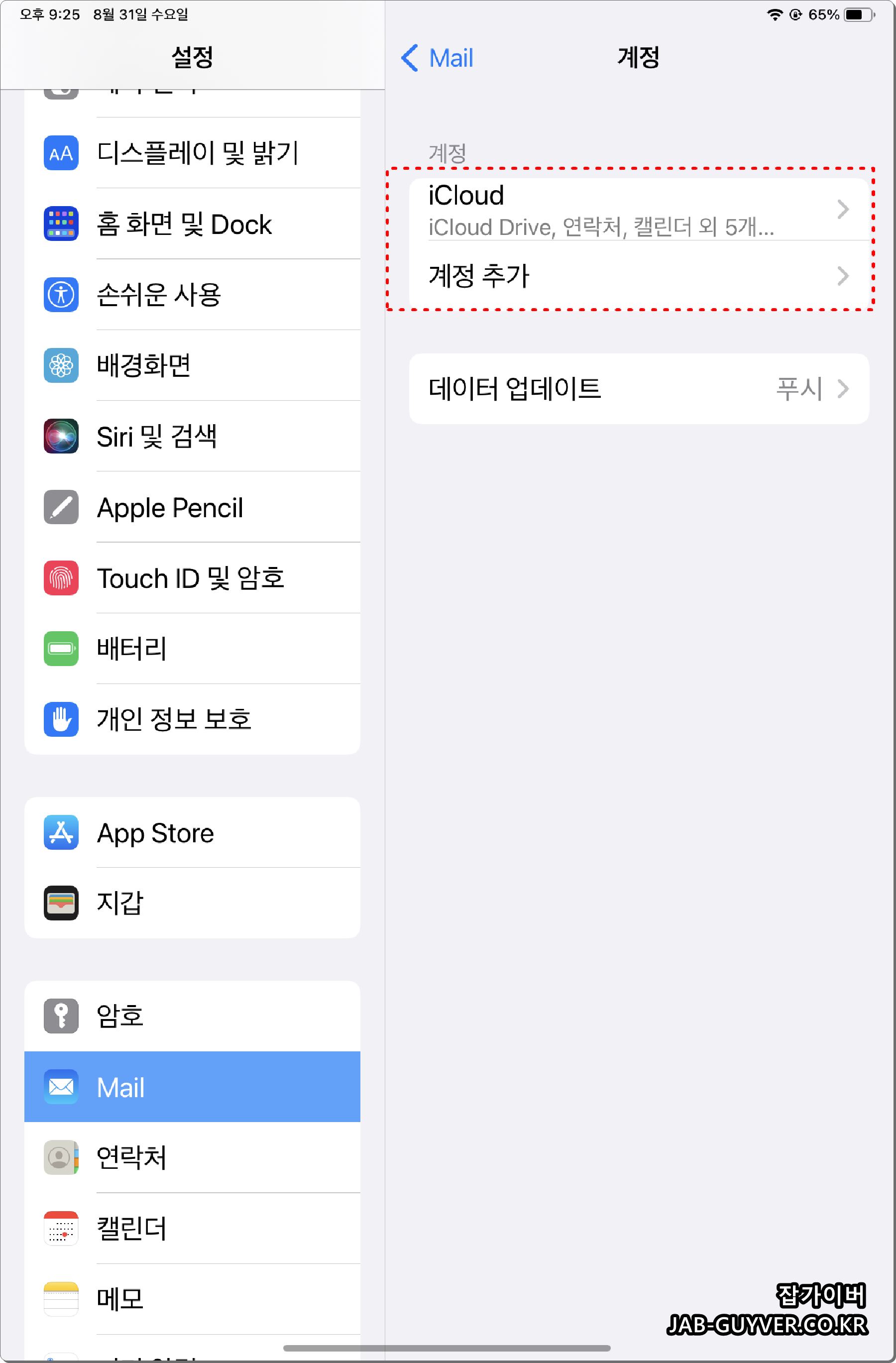 Maill -> 계정 을 통해 계정을 추가하거나 아이클라우드 드라이버, 연락처, 캘린더등을 가져옵니다.