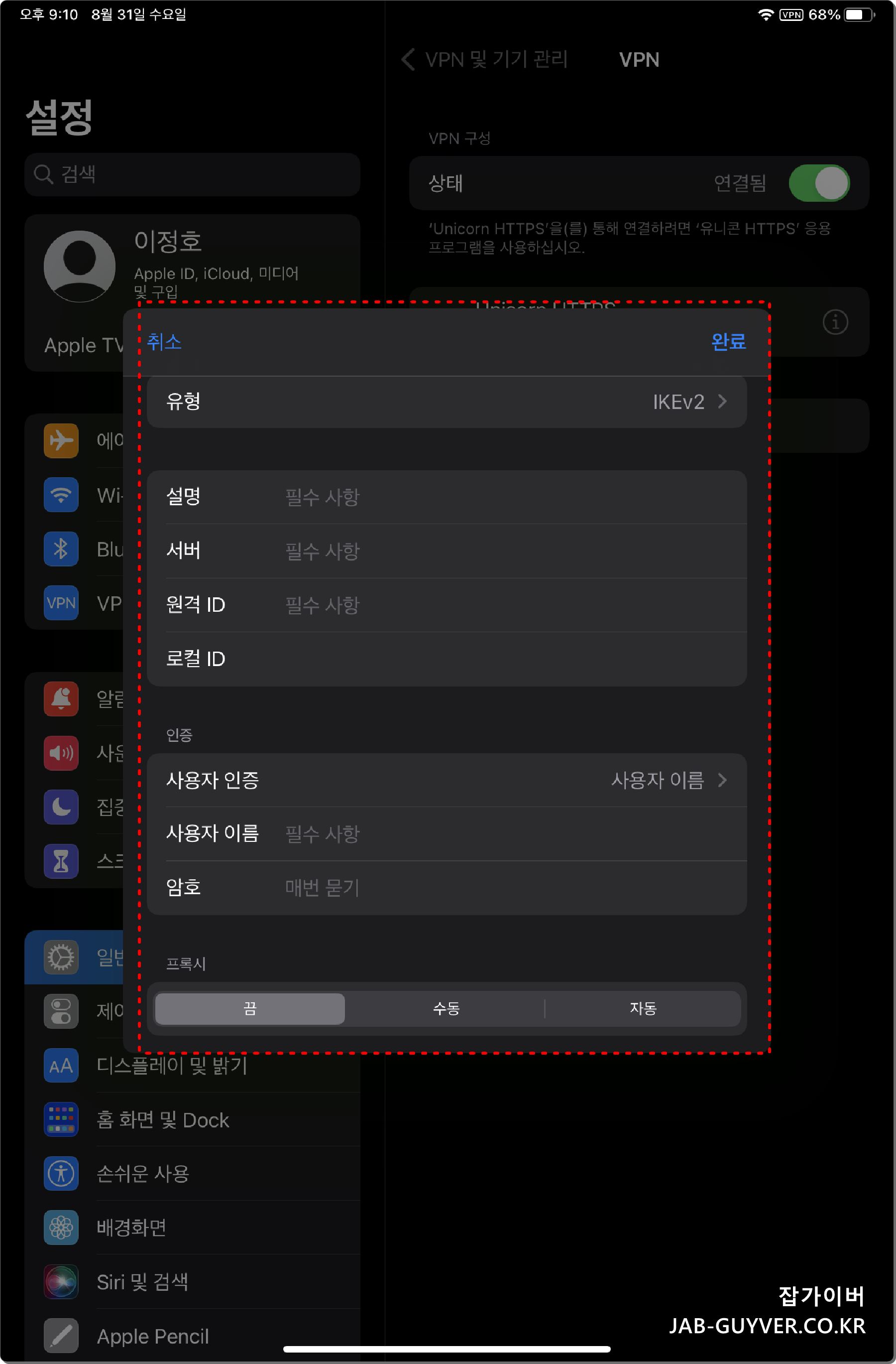 추가로 수동으로 VPN 설정을 원한다면 VPN 구성추가를 통해 위 정보를 입력해줍니다.