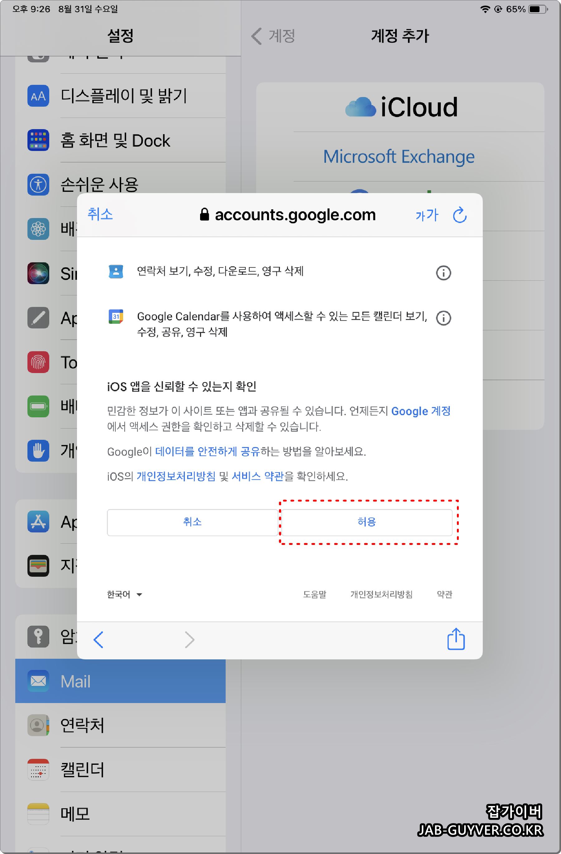 구글의 지메일을 추가하는 경우 계정연동 후 iOS 계정에 엑세스를 허용합니다.