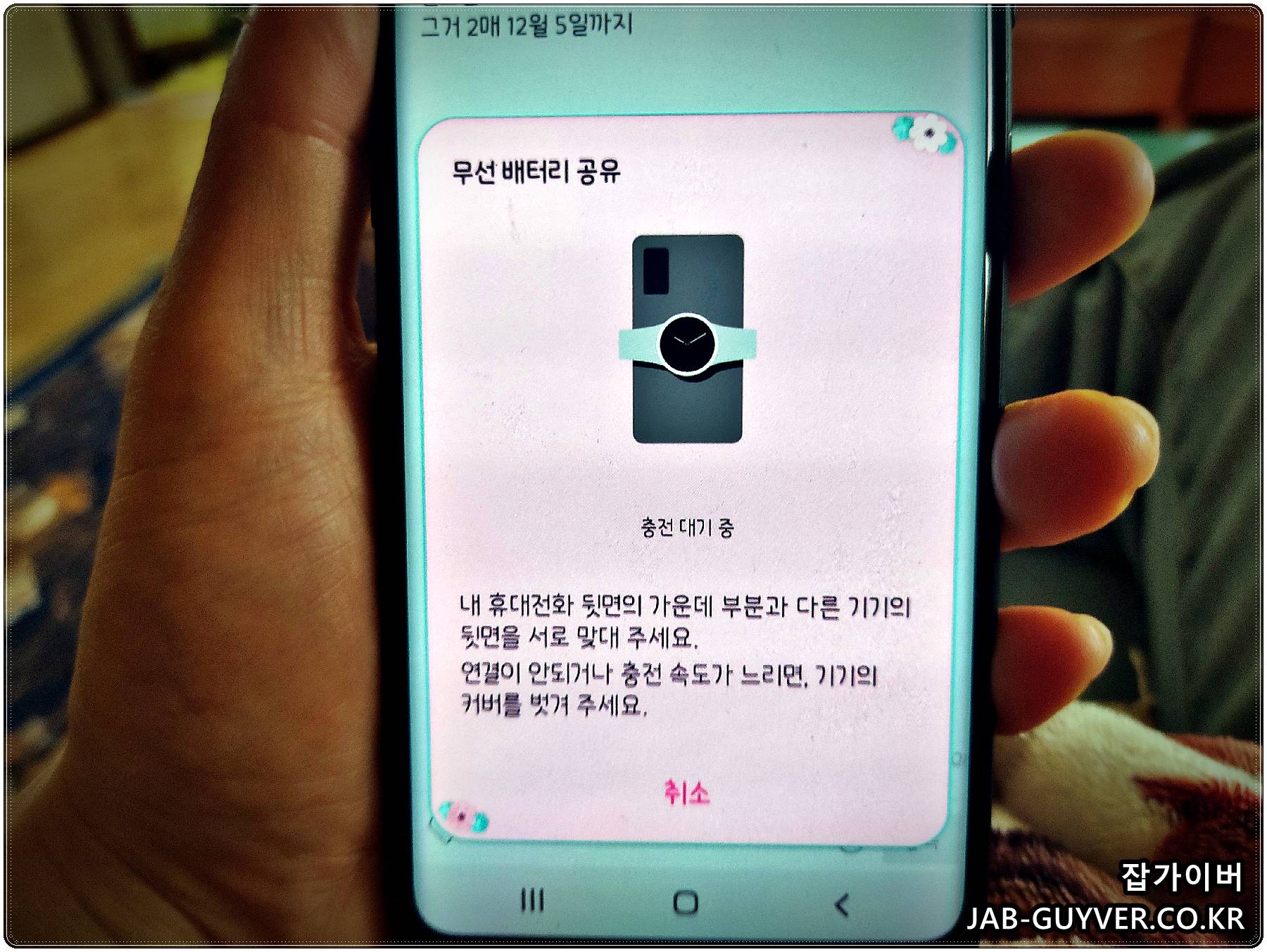 이후 휴대전화 뒷면 가운데에 갤럭시워치 및 다른 핸드폰을 올려두면 무선충전 배터리공유가 가능합니다.