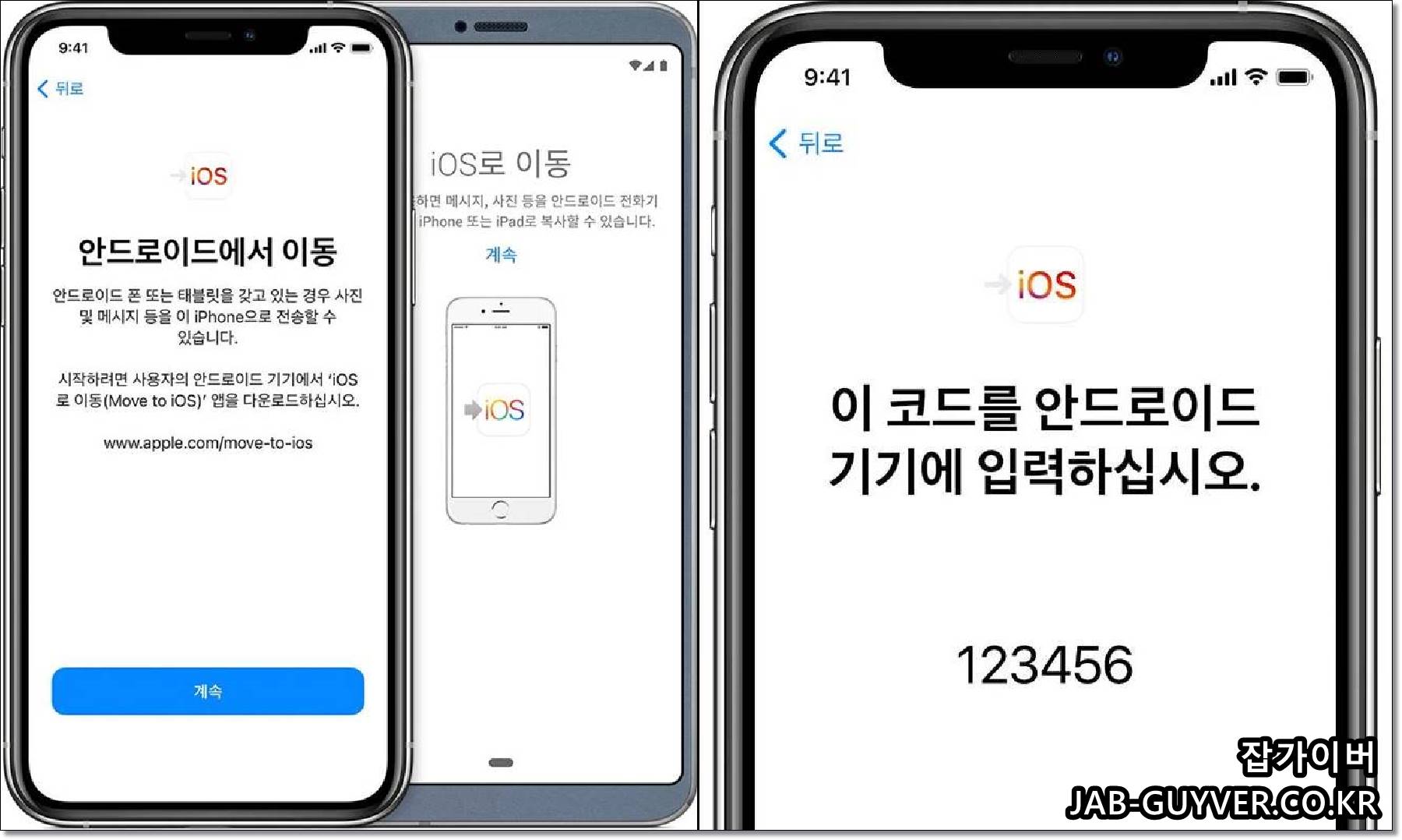 | Move to iOS 앱 | 아이폰 (데이터 받기), 안드로이드 (데이터 보내기) | 연락처, 메시지, 사진, 캘린더, 메일 계정 | 아이폰으로 넘어갈 때 공식 지원. 와이파이 연결 필요 |