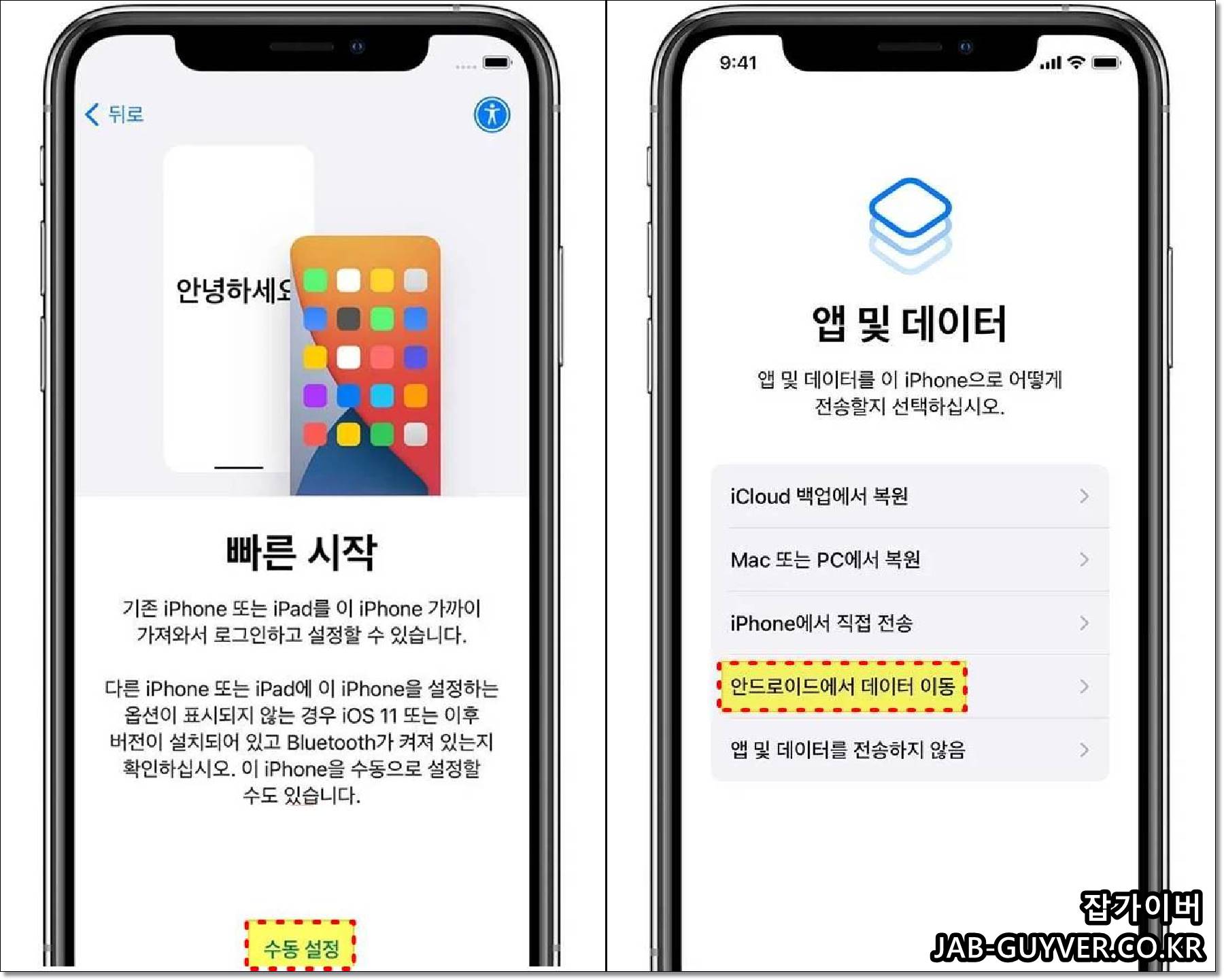 아이폰 빠른시작을 통해 수동설정 -> 앱 및 데이터로 들어갑니다.