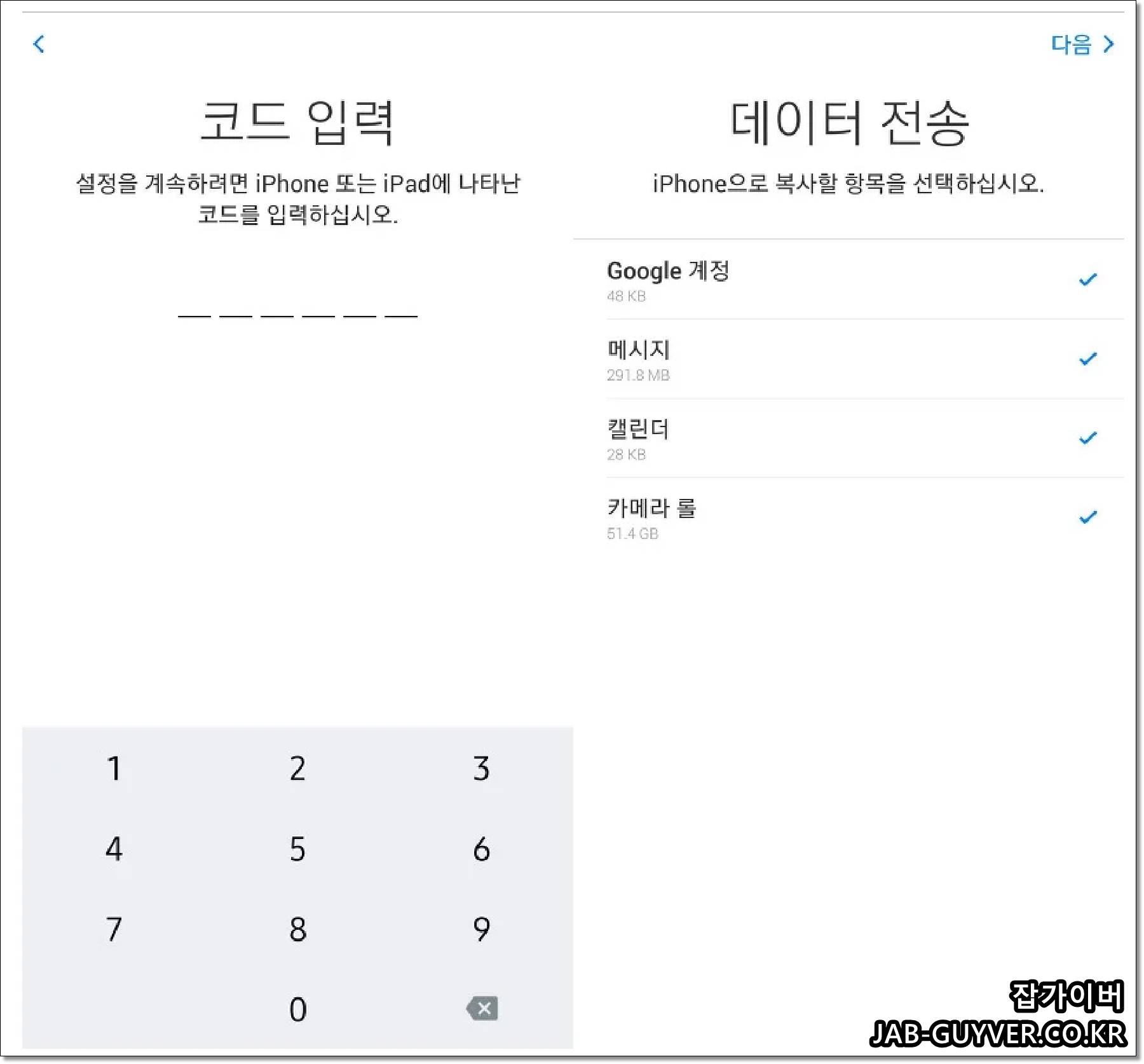 코드를 입력햇다면 전송하고자 하는 계정 및 메시지, 캘린더, 사진등을 선택해서 아이폰 정보를 안드로이드로 전달합니다.