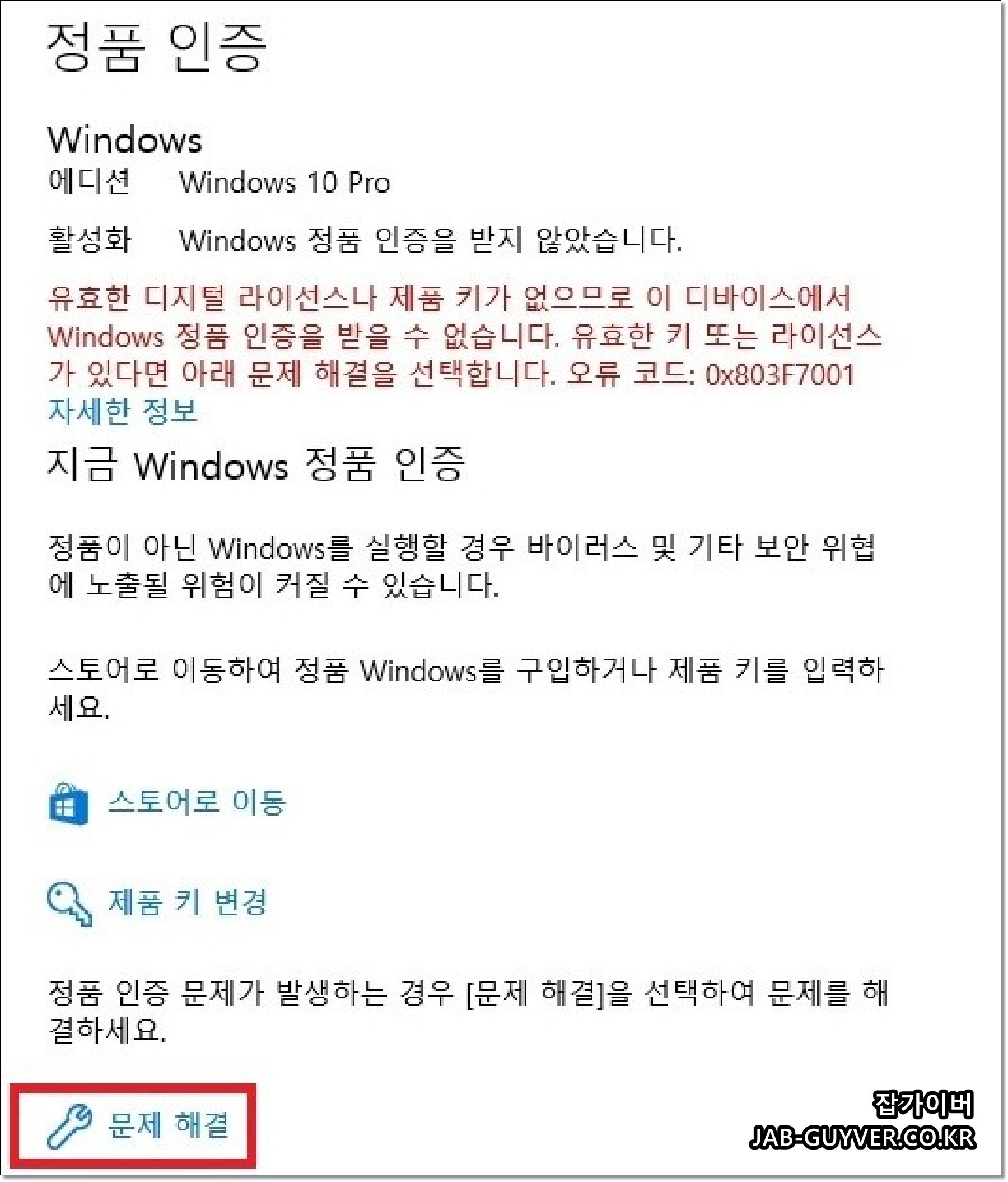 그럼 기존에 등록된 노트북 및 PC의 메인보드에 윈도우 제품키가 등록되어 있기 때문에 "Windows 정품인증을 받지 않았습니다" 유효한 디지털 라이선스나 제품 키가 없으므로 이 디바이스에서 Windows 정품인증을 받을 수 없습니다. 유효한 키 또는 라이선스가 있다면 아래 문제해결을 선택합니다, 오류코드 : 0x803f7001